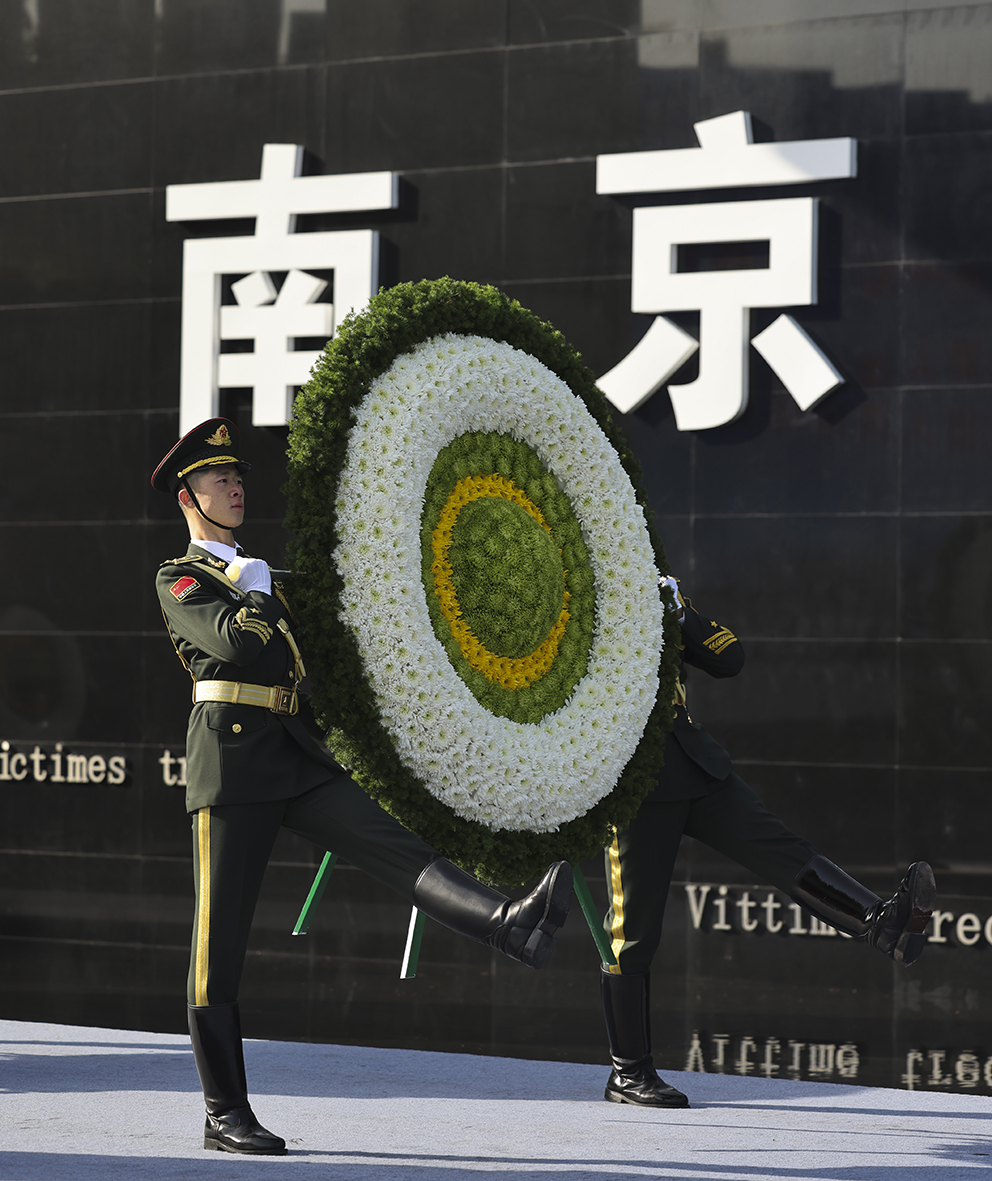 仪仗队向30余万南京大屠杀遇难同胞敬献花圈。(图片来源:新华社)