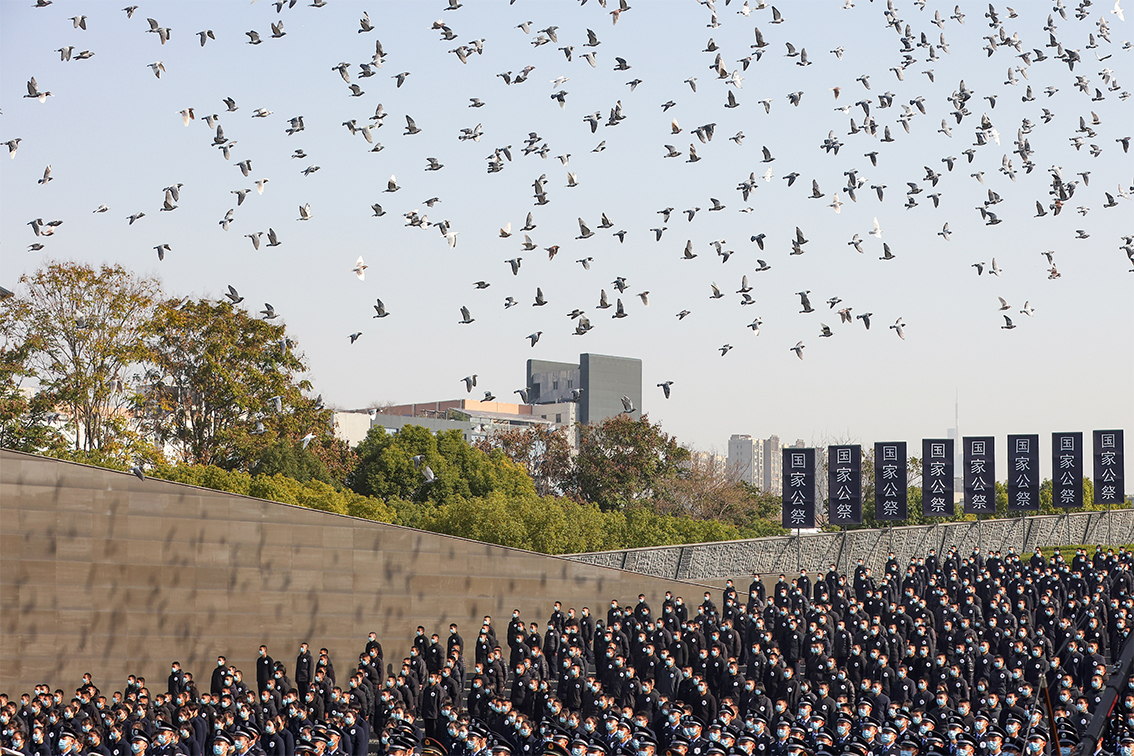 南京大屠杀死难者国家公祭仪式现场放飞和平鸽。(图片来源:中新社)