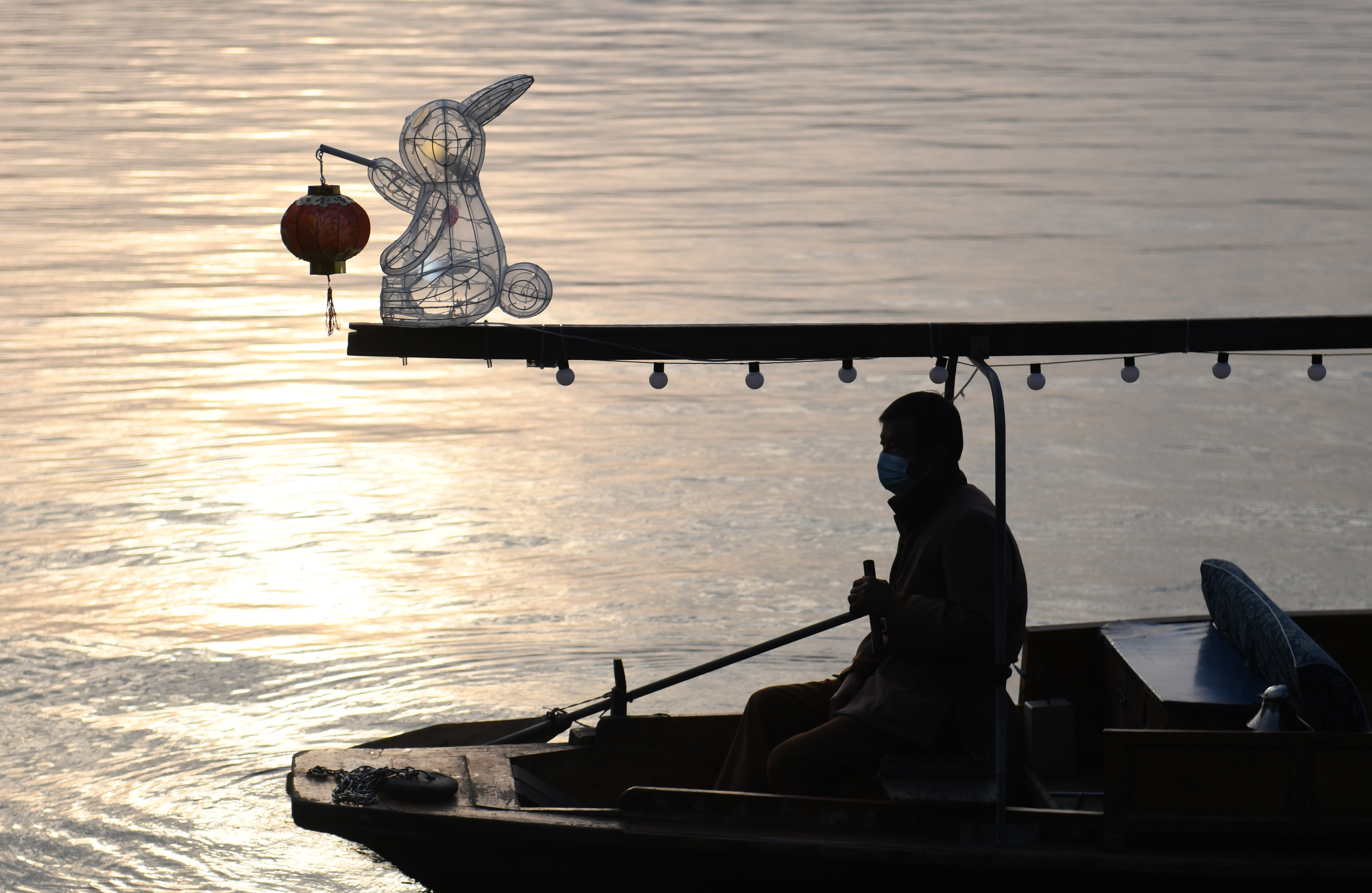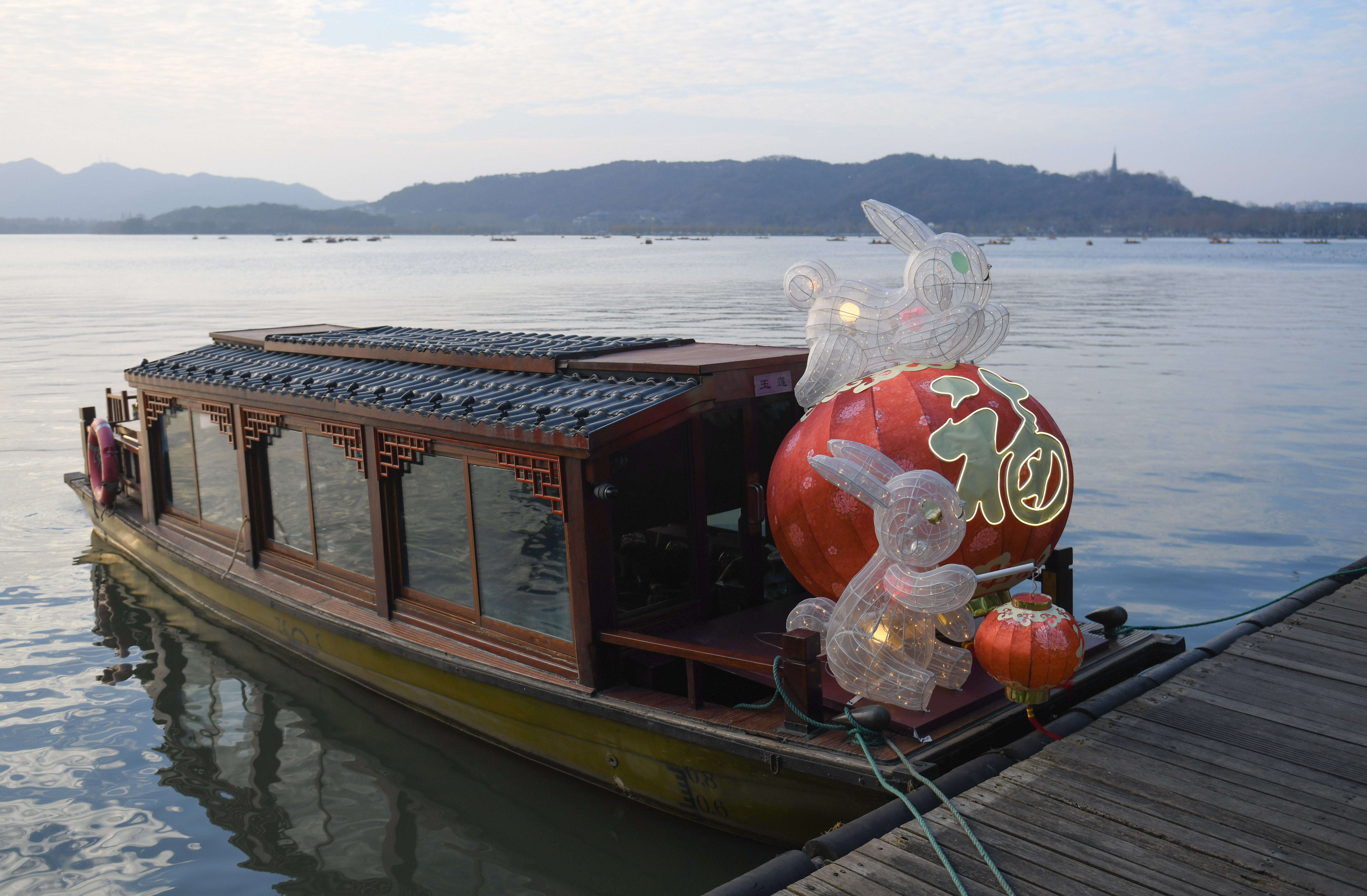 10日,西湖游船上的兔子花灯为景区增添节日氛围。