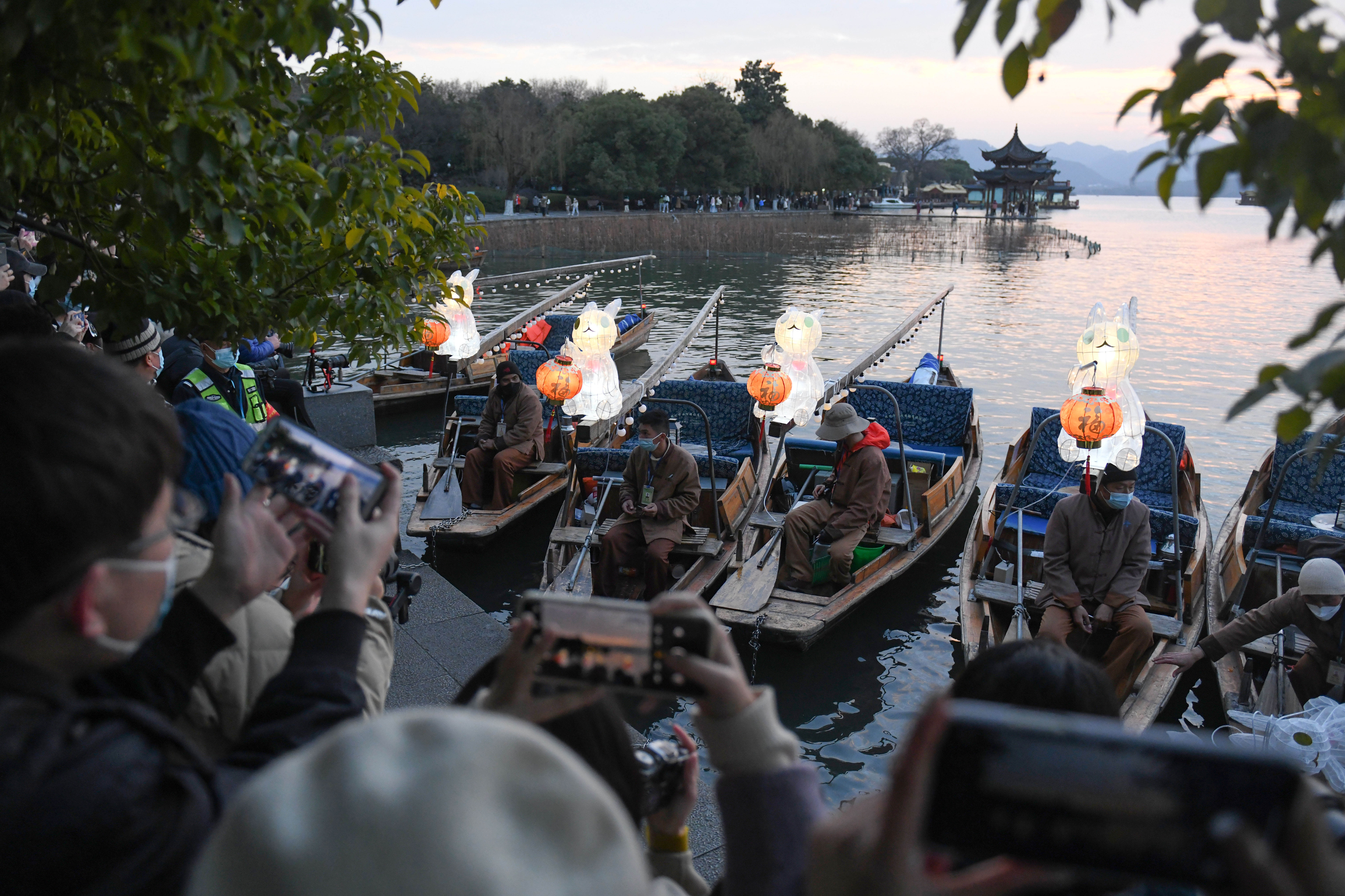 近日,30条以兔子花灯装饰的“福气”游船亮相浙江杭州西湖,浓浓年味吸引游客。