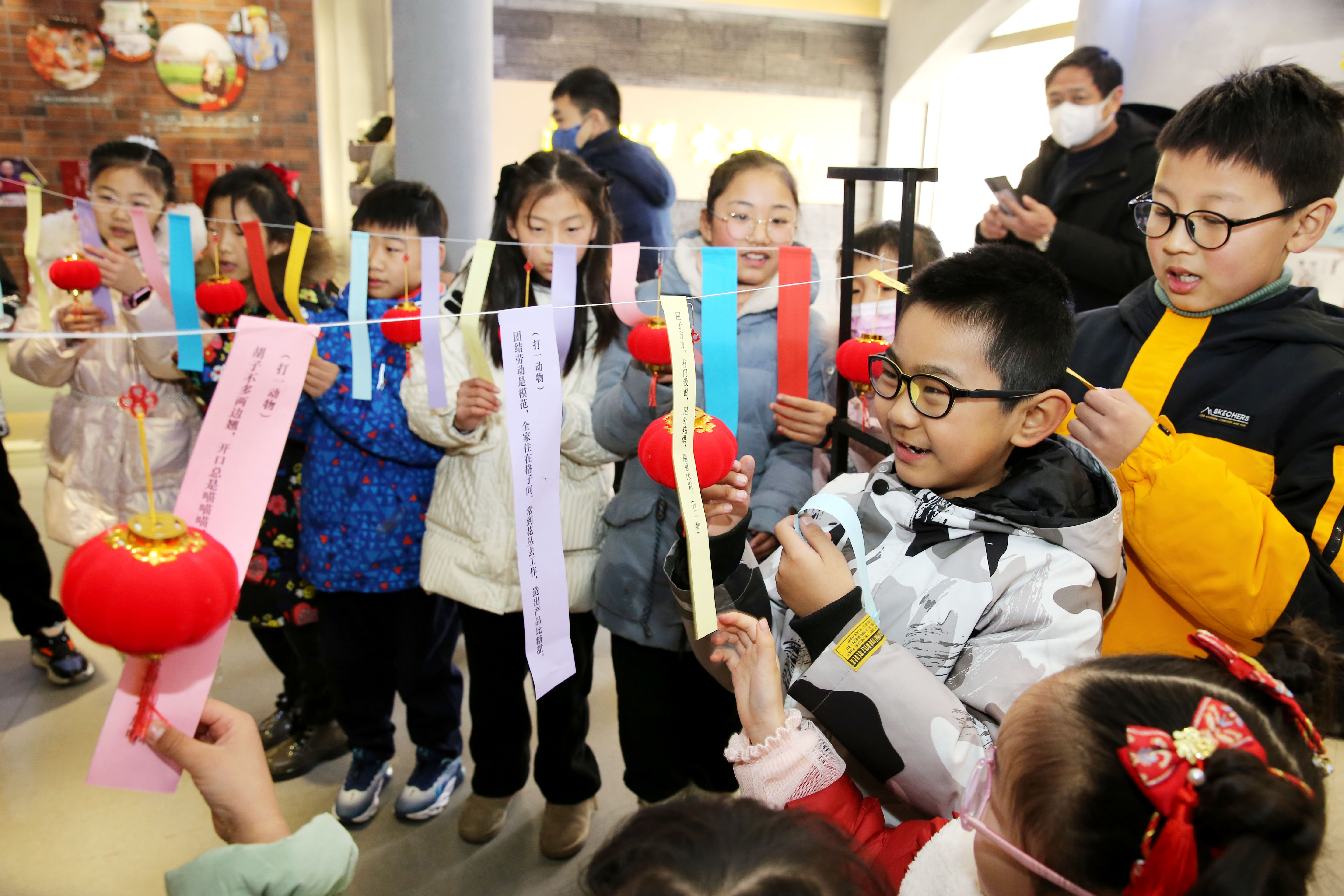 2日,孩子们在江苏省连云港市连云区墟沟街道大巷社区猜谜语。(图片来源:新华社)