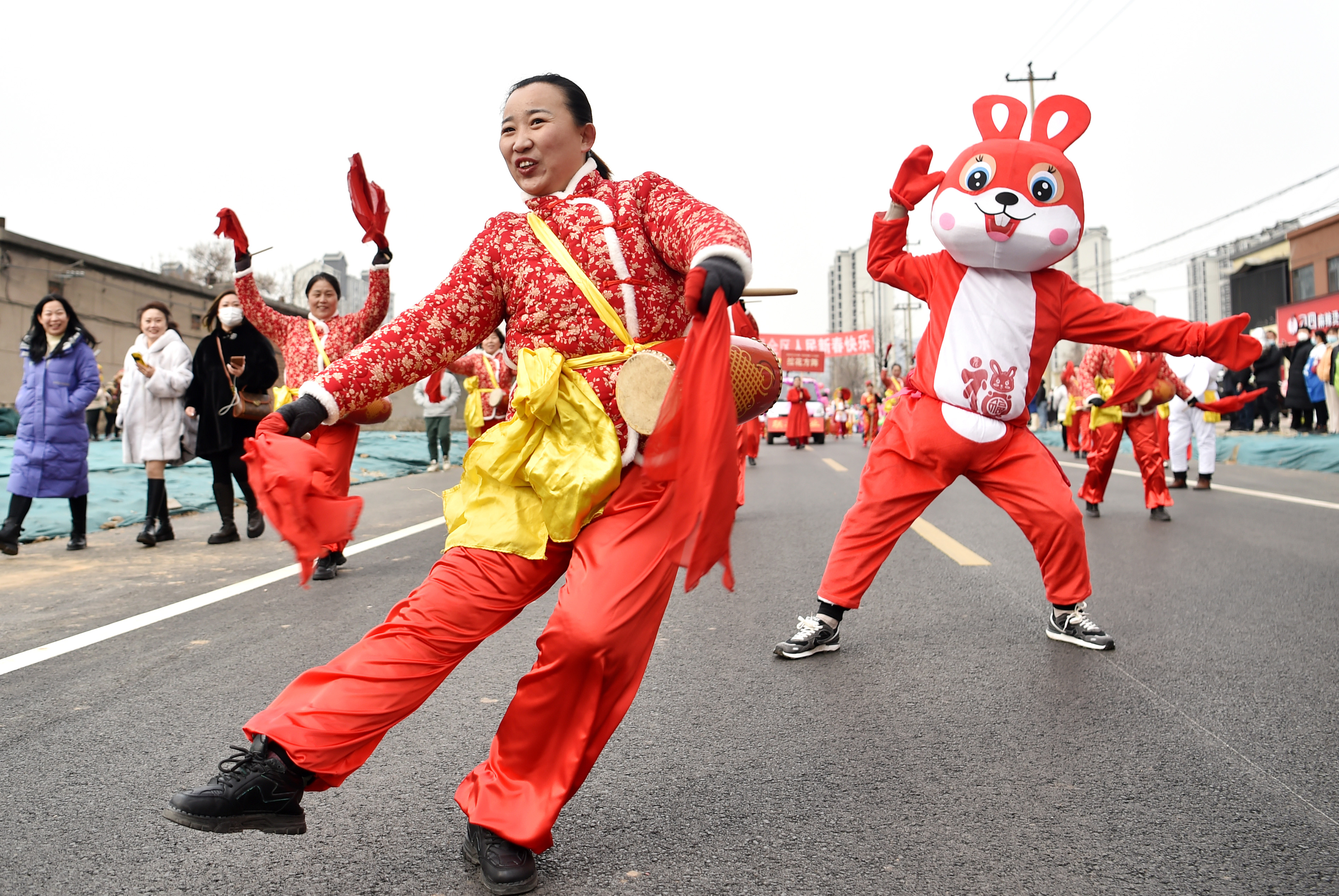 2日,女子腰鼓队在河北省石家庄市井陉矿区举行的民间花会展演活动中进行踩街表演。(图片来源:新华社)