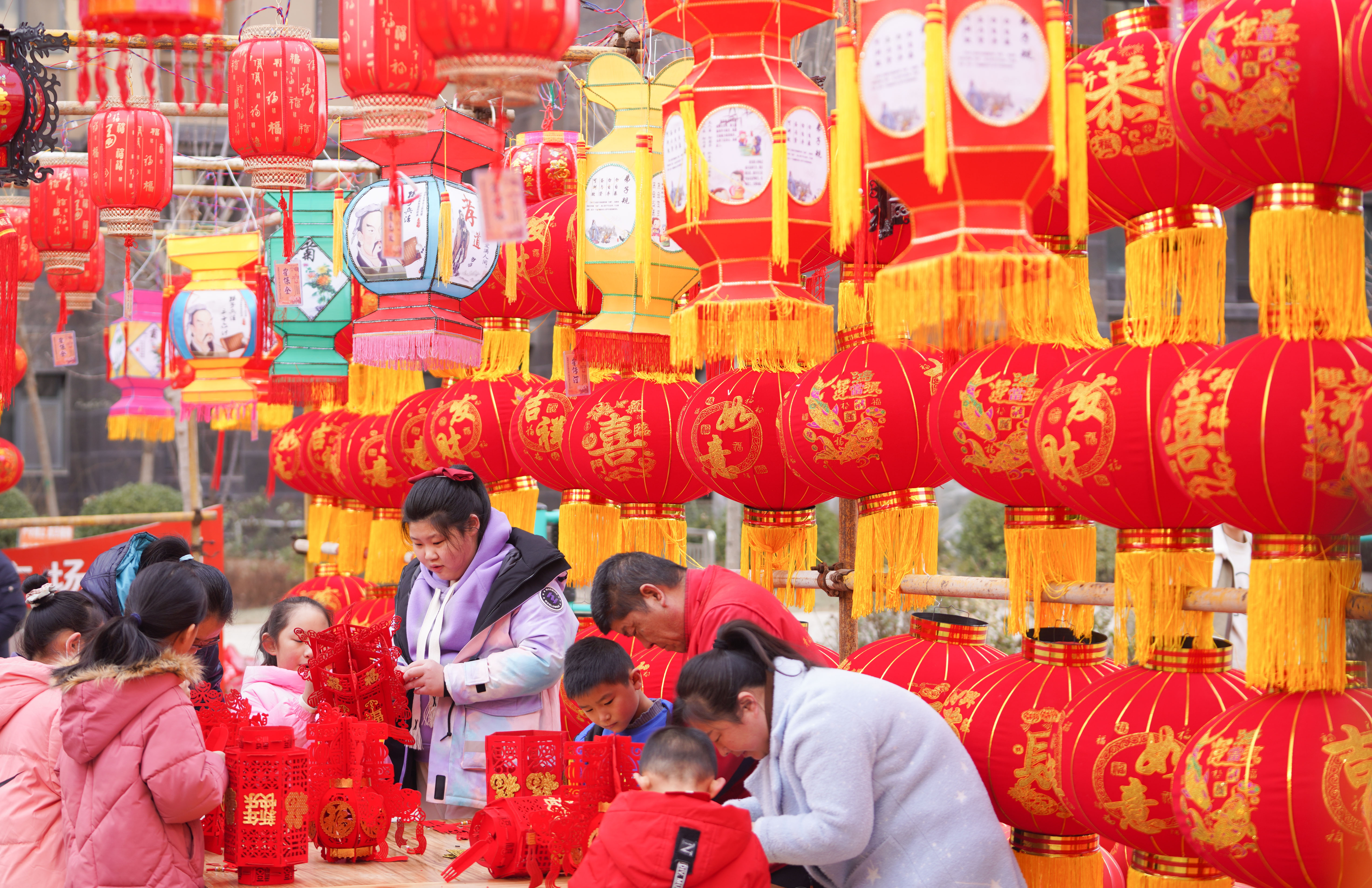 2日,山东省邹平市黄山街道崔家社区居民在组装各式红灯笼。(图片来源:新华社)