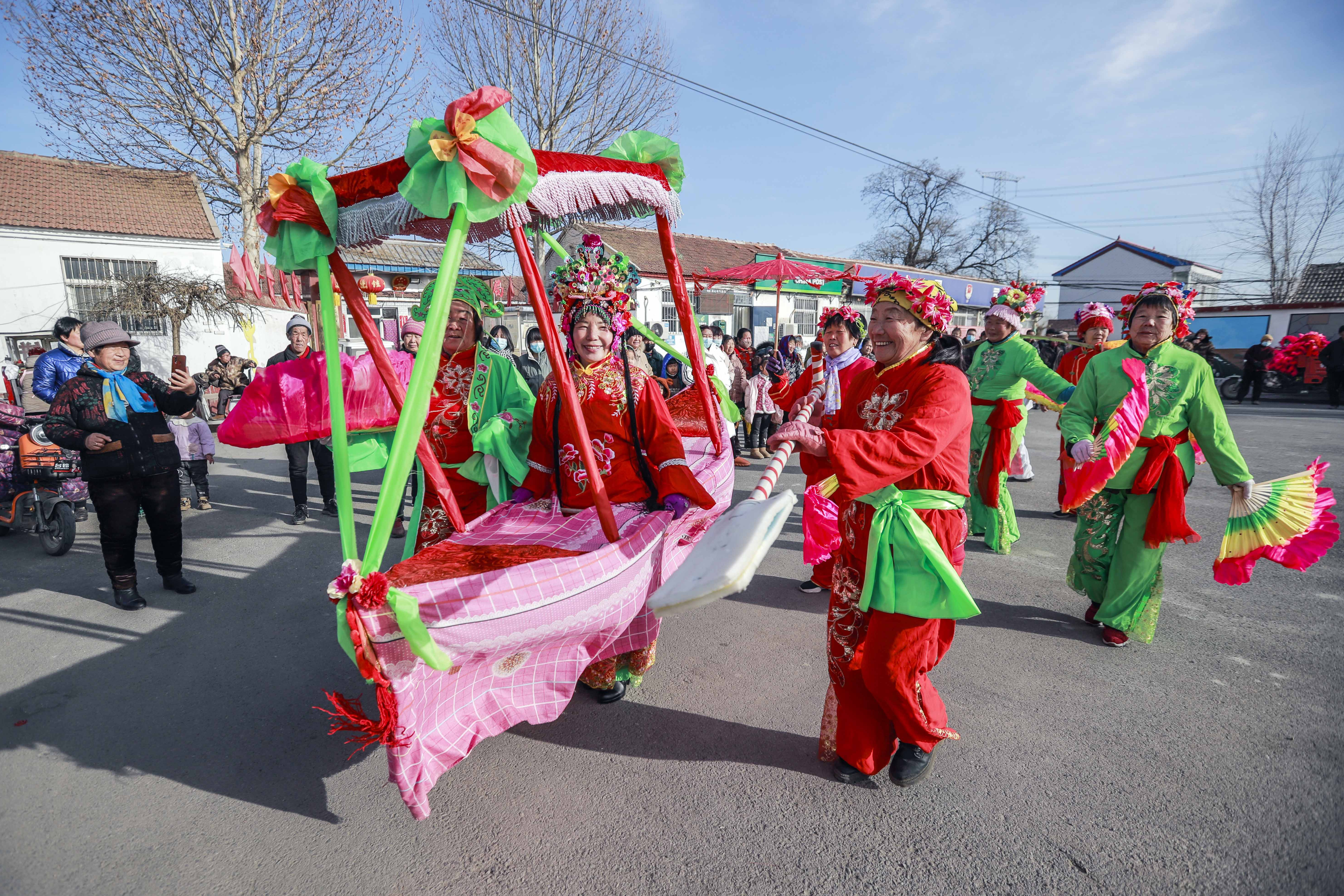 2日,河北省遵化市西下营满族乡的民间艺人在表演划旱船。(图片来源:新华社)