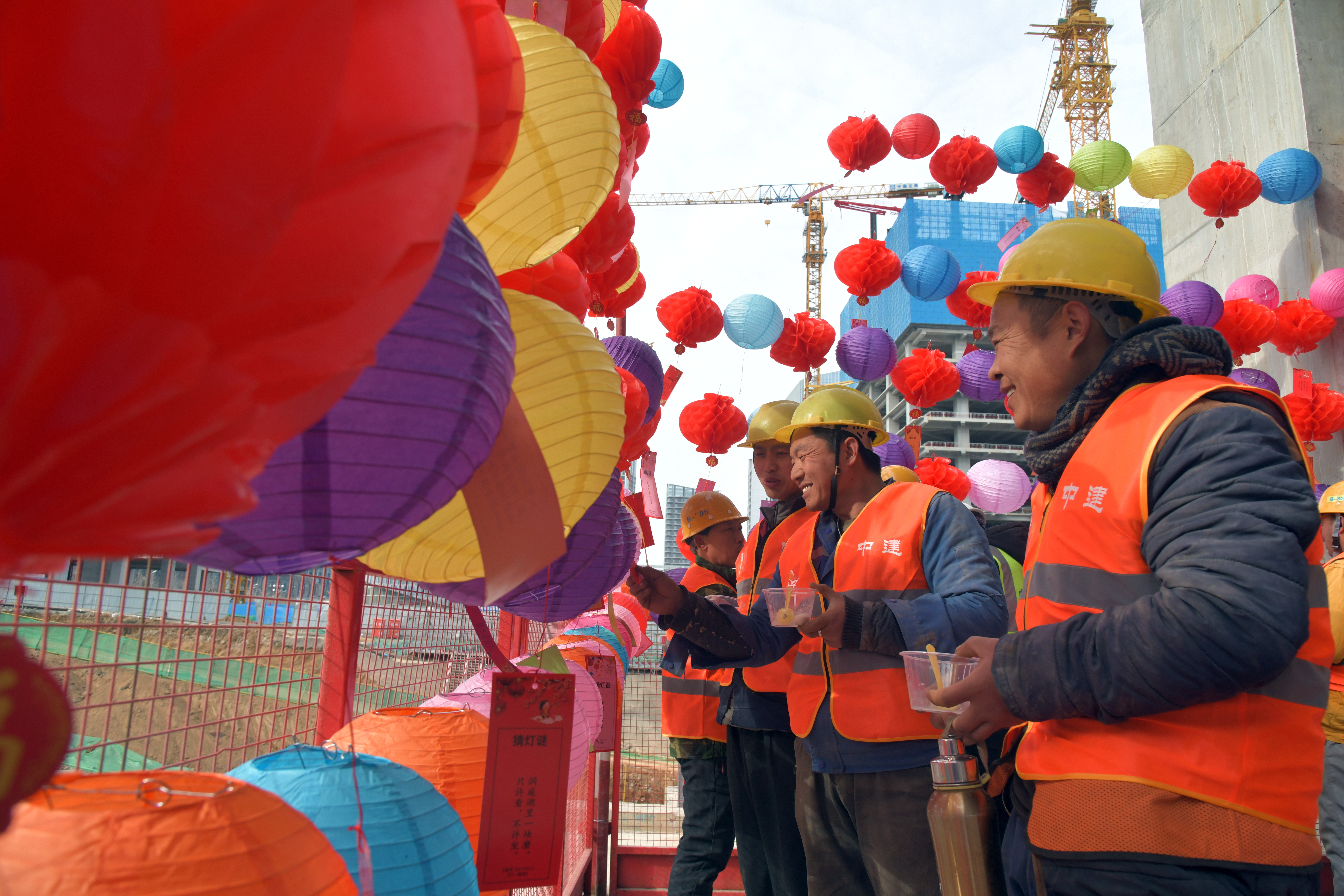 2日,施工人员在山东济南国际金融城北区项目现场猜灯谜。(图片来源:新华社)