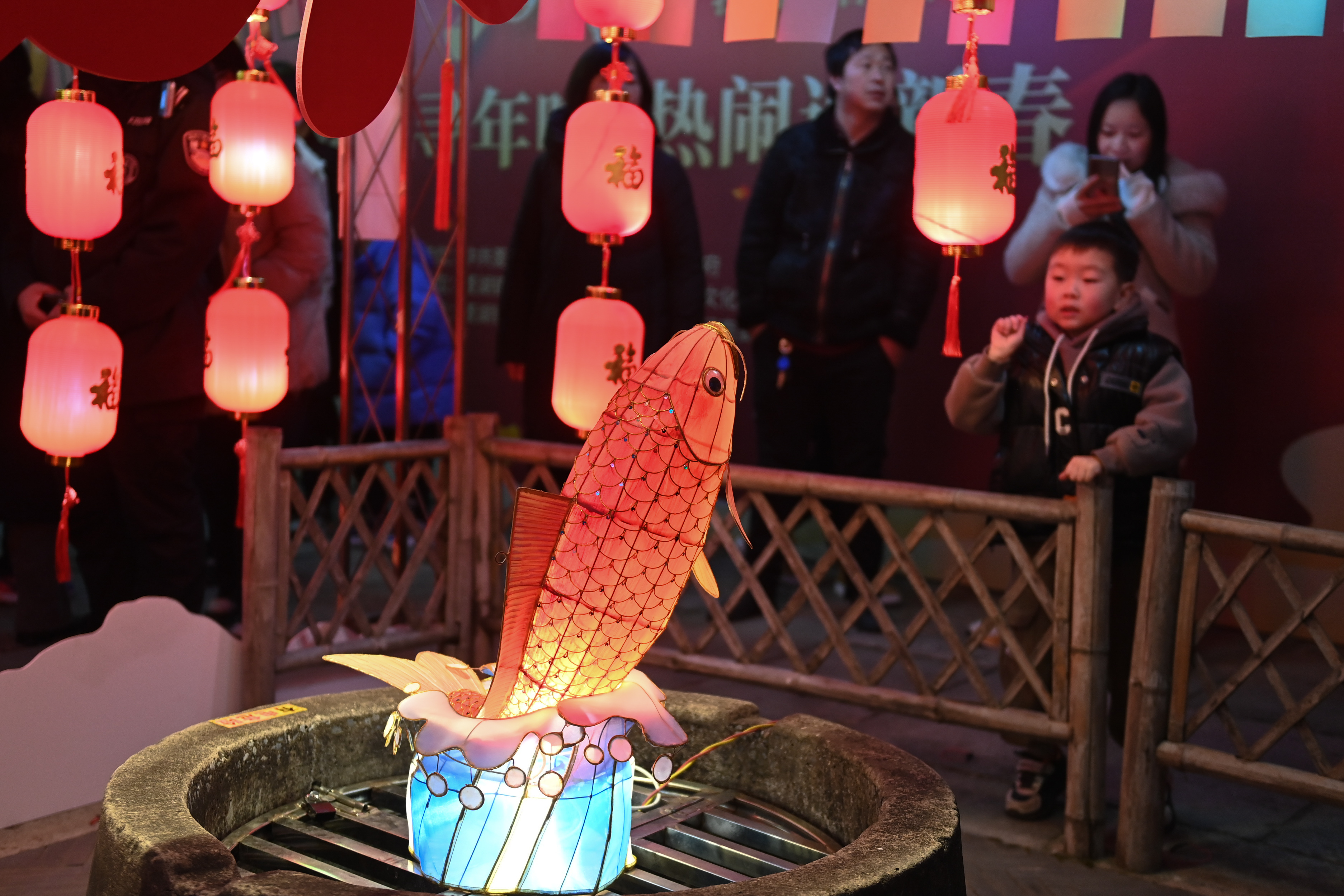 2日,小朋友在浙江省湖州市南浔区菱湖镇在古镇景区观赏具有当地文化特色的鱼灯。(图片来源:新华社)