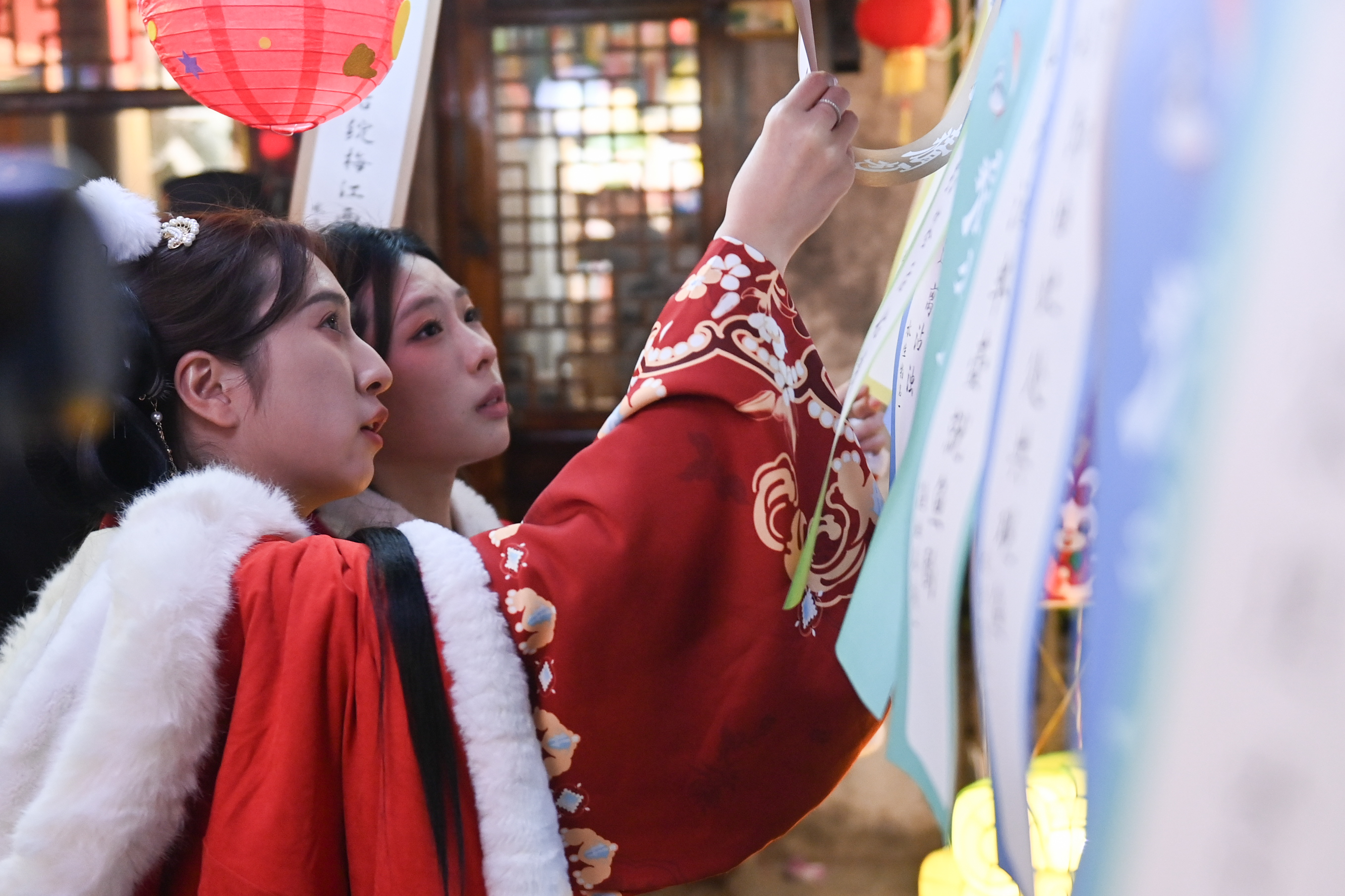 2日,两名身着古装的女孩在浙江省湖州市南浔区菱湖镇在古镇景区猜灯谜。(图片来源:新华社)