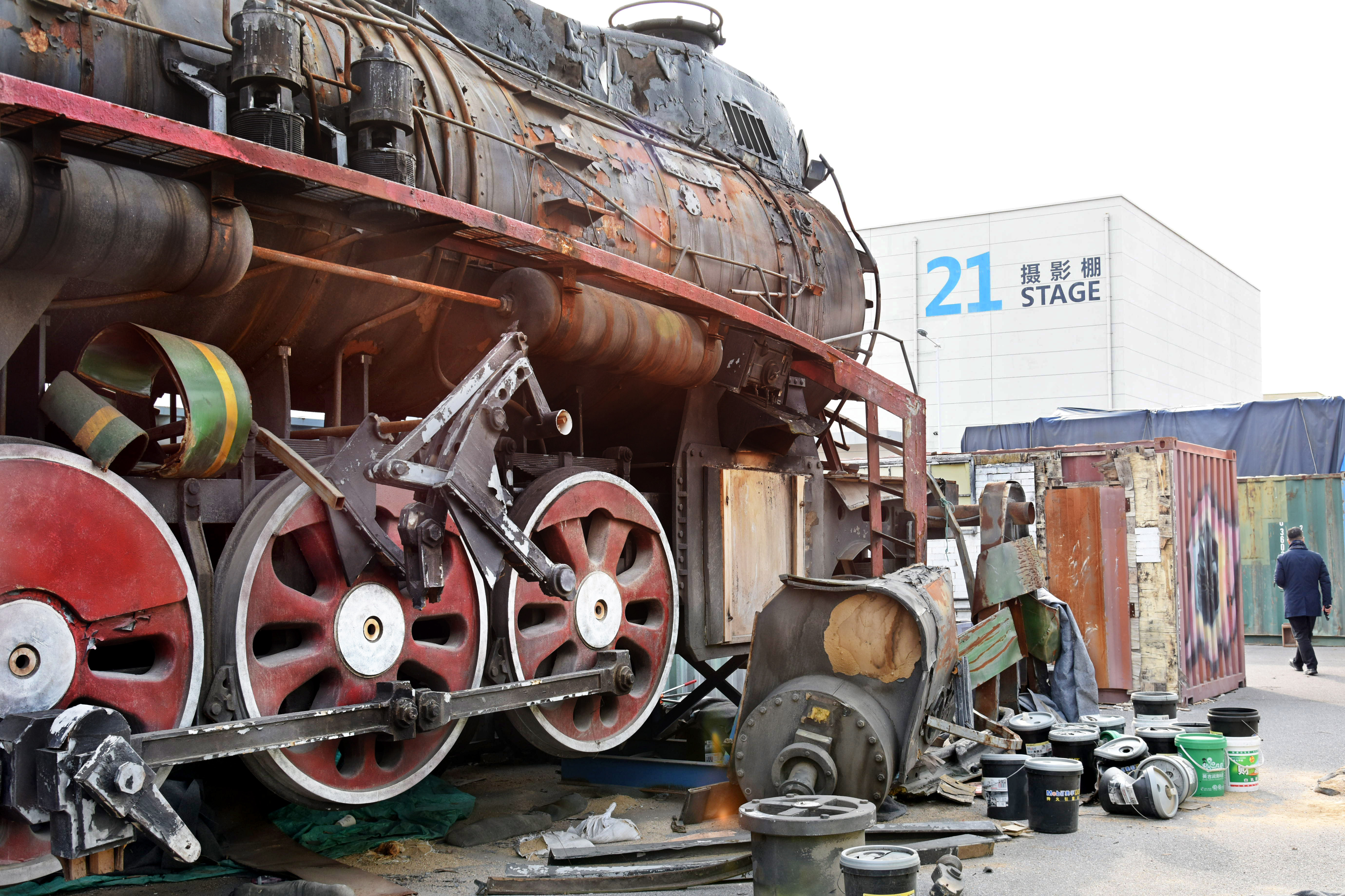 8日,青岛东方影都影视产业园置景车间外的一个道具火车头。(图片来源:新华社)
