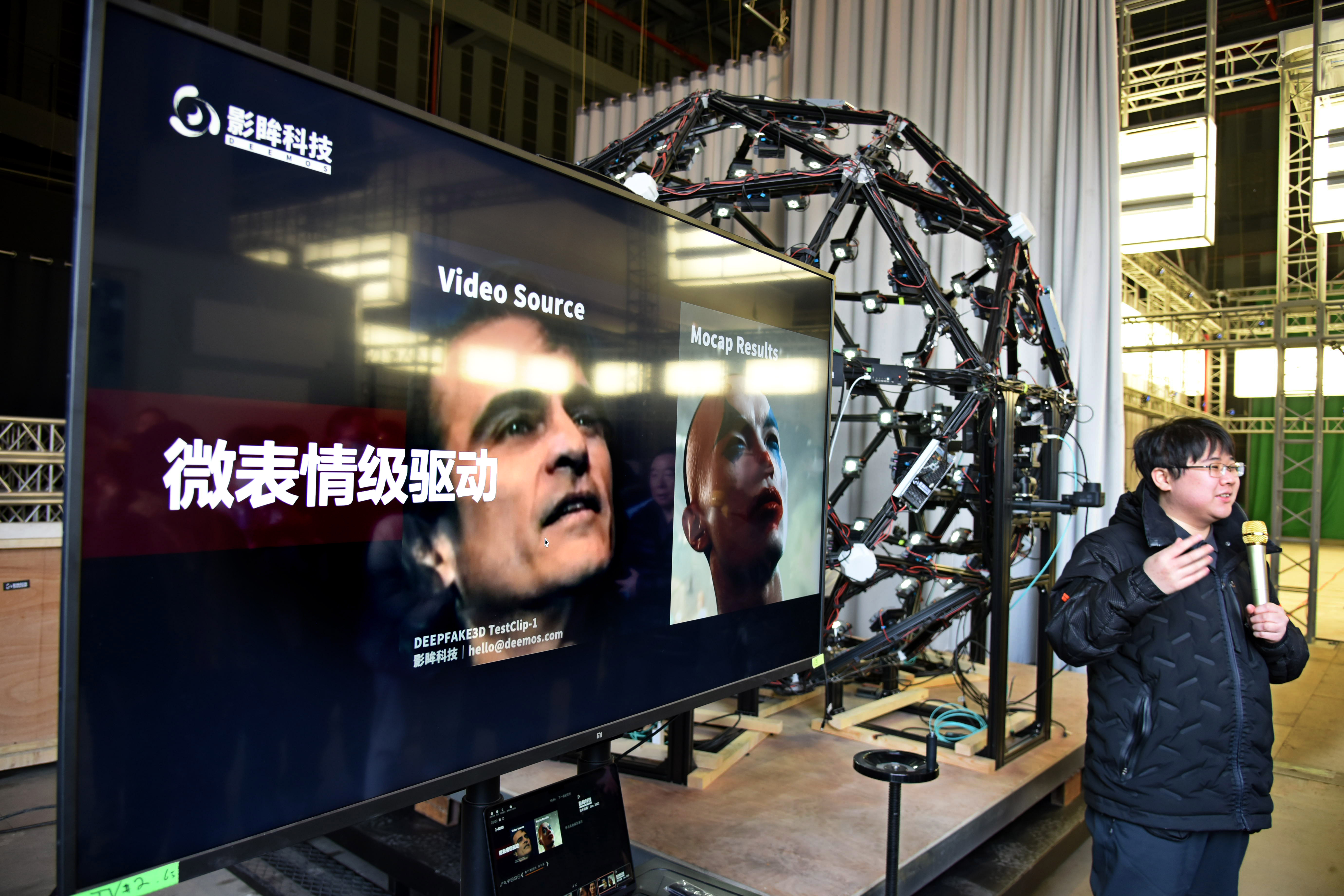 8日,青岛东方影都影视产业园工作人员在介绍微表情捕捉技术。(图片来源:新华社)