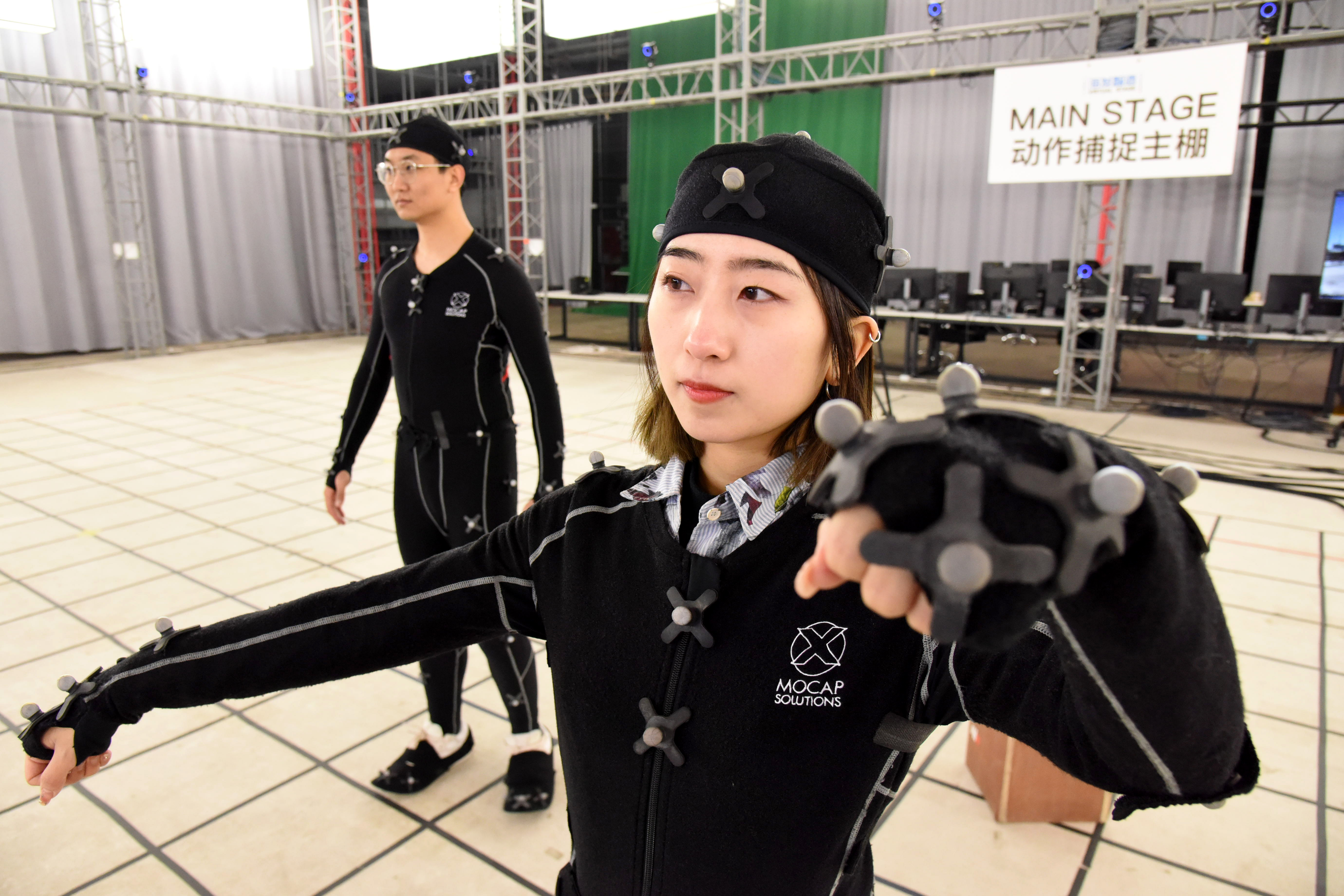 8日,青岛东方影都影视产业园工作人员在演示动作捕捉技术。(图片来源:新华社)