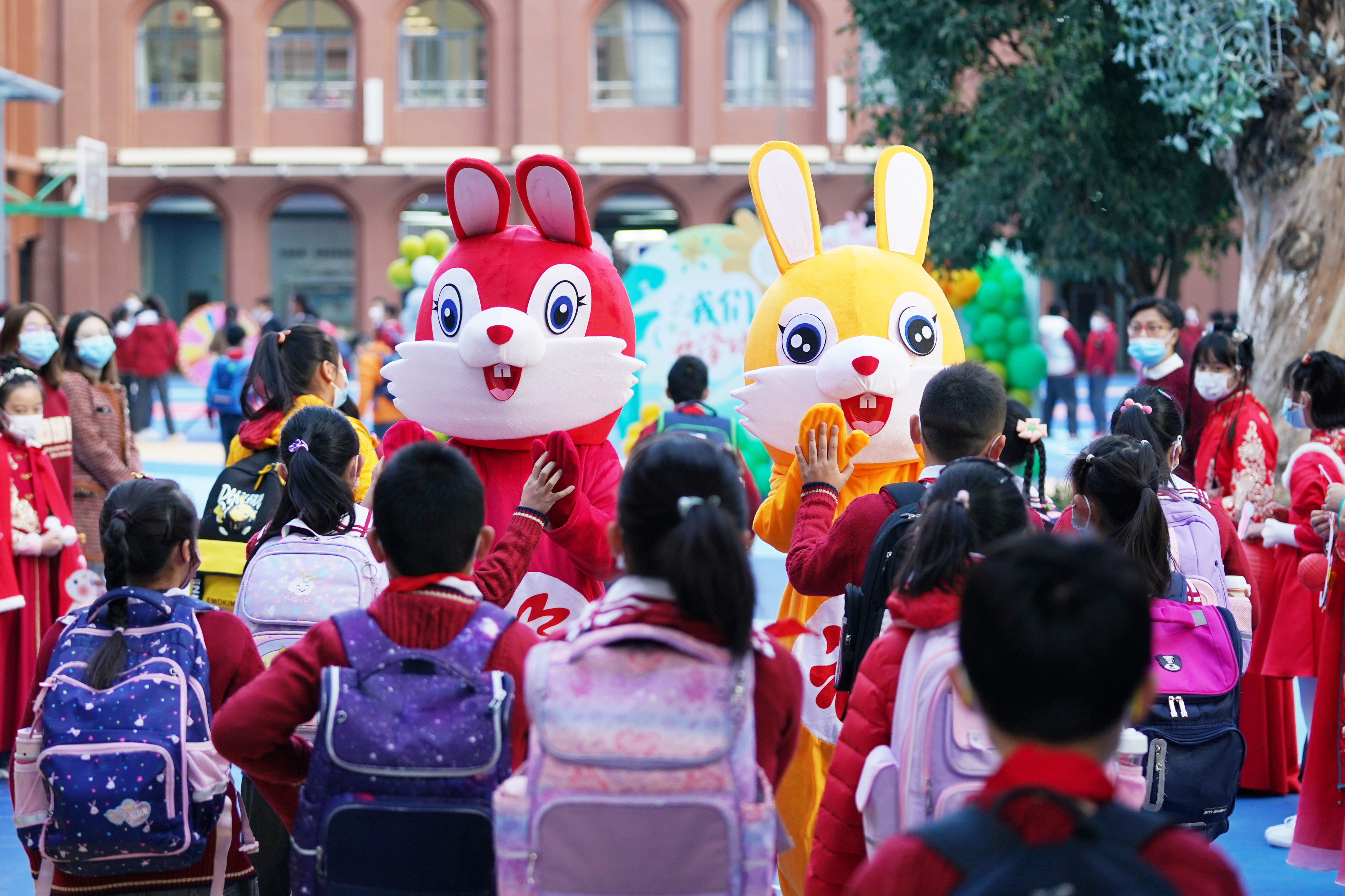 13日,昆明市武成小学人民路校区,“兔宝宝”欢迎学生入校。当日,昆明市中小学校全面开学。