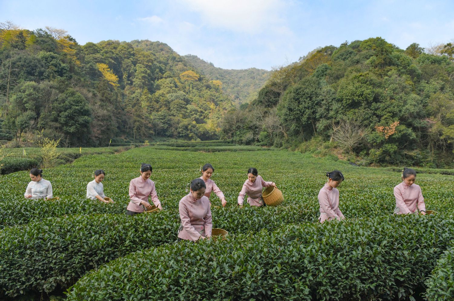 13日,多名工作人员在采摘明前西湖龙井茶。