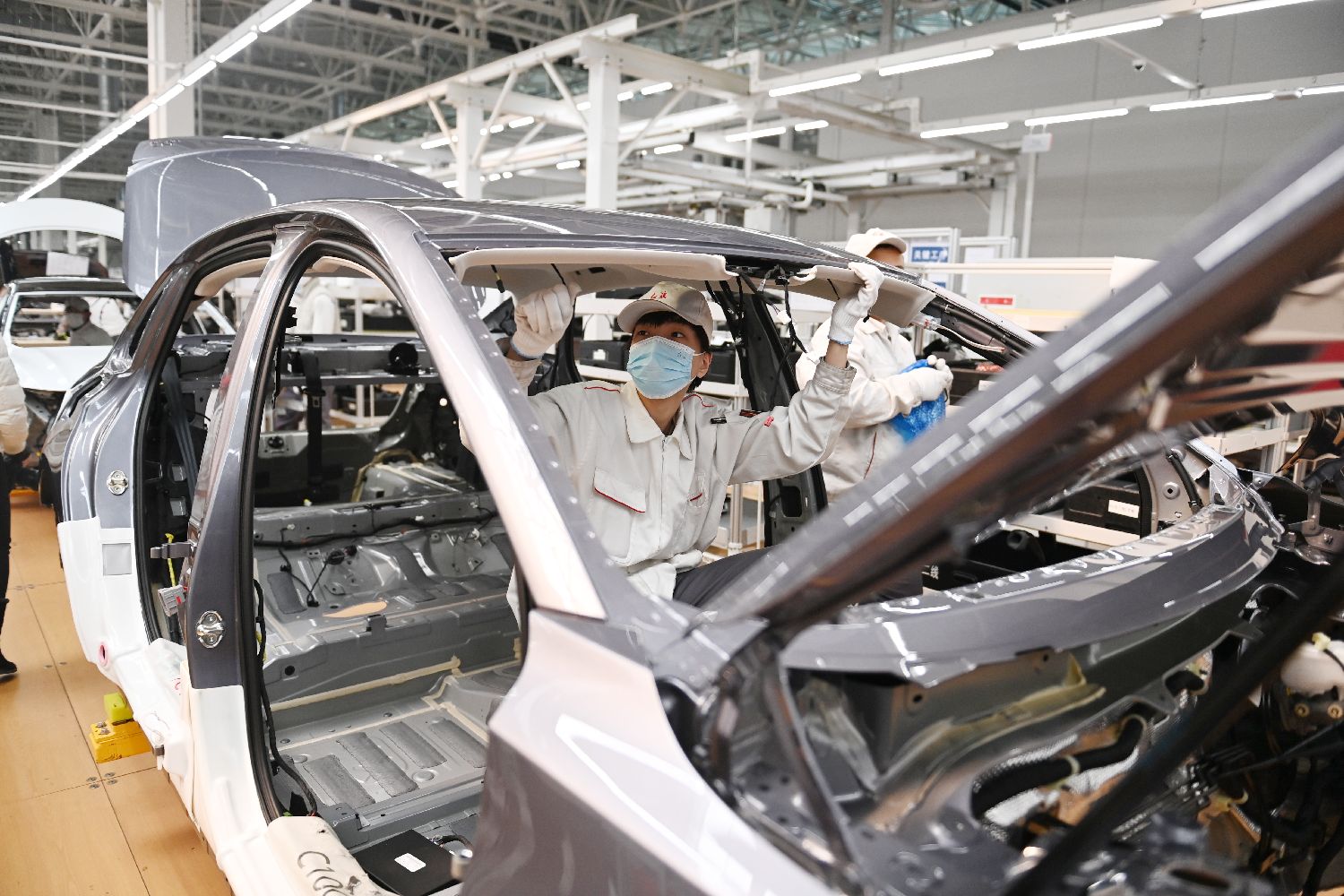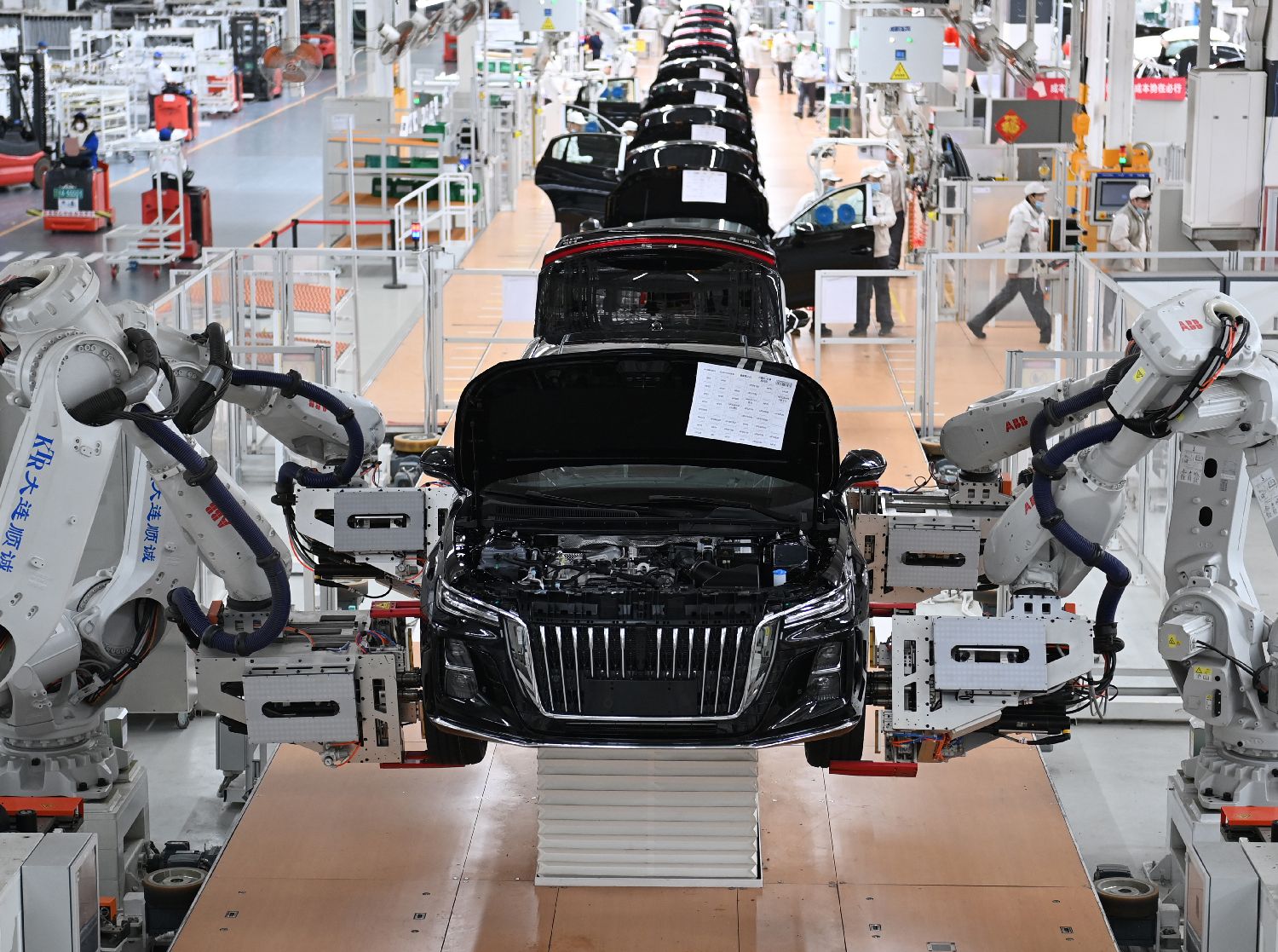 16日,在吉林长春的中国一汽红旗制造中心繁荣厂区,工人在车辆终检生产线进行质检。(图片来源:中新社)