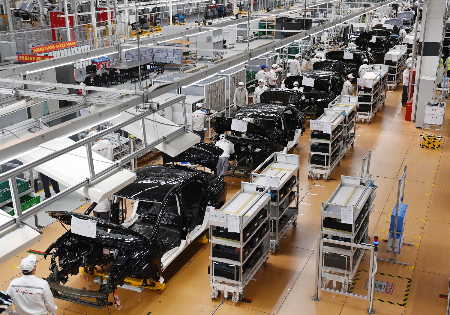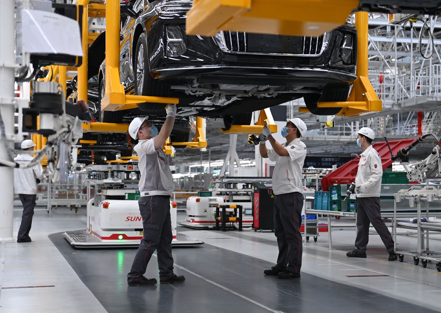 16日,在吉林长春的中国一汽红旗制造中心繁荣厂区,工人正在进行底盘合装。(图片来源:中新社)
