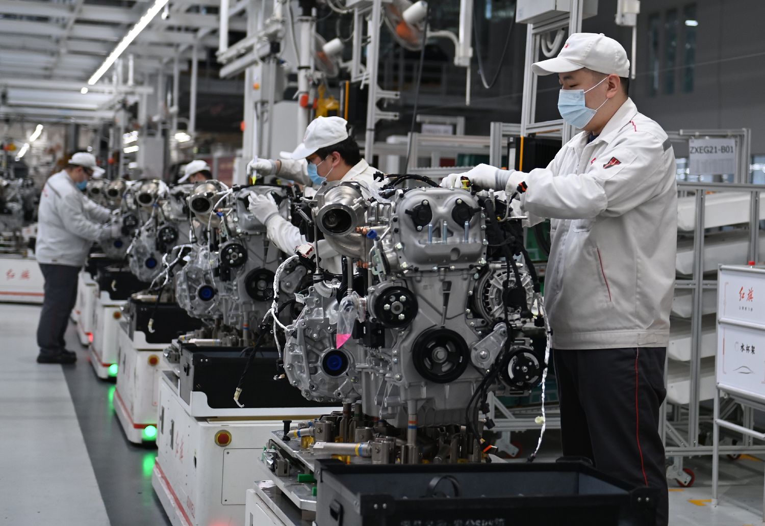 16日,在吉林长春的中国一汽红旗制造中心繁荣厂区,工人在组装发动机。(图片来源:中新社)