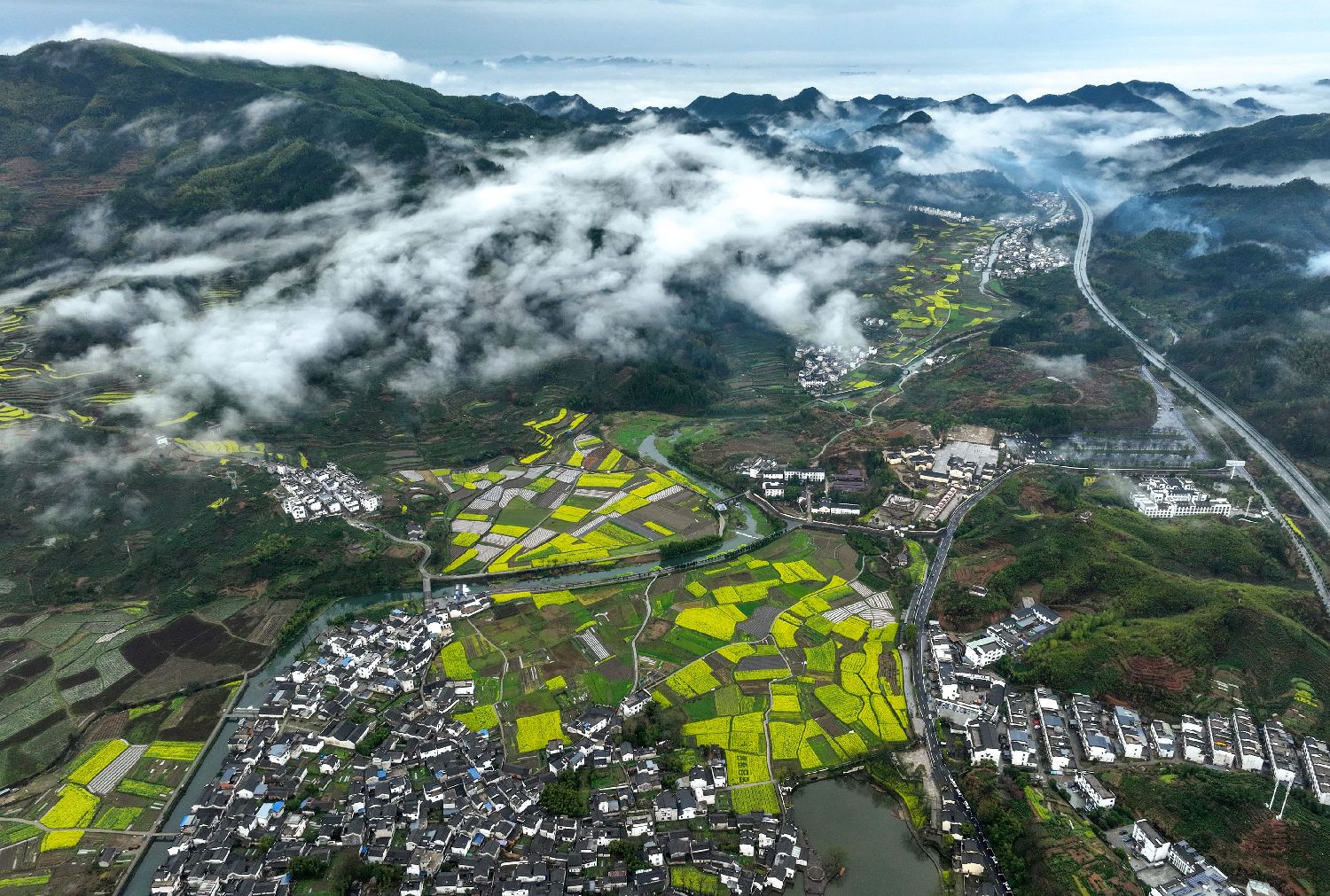 22日,春雨初歇的安徽省黄山市徽州区呈坎古村落碧波清影,云海翻涌。(图片来源:中新社)