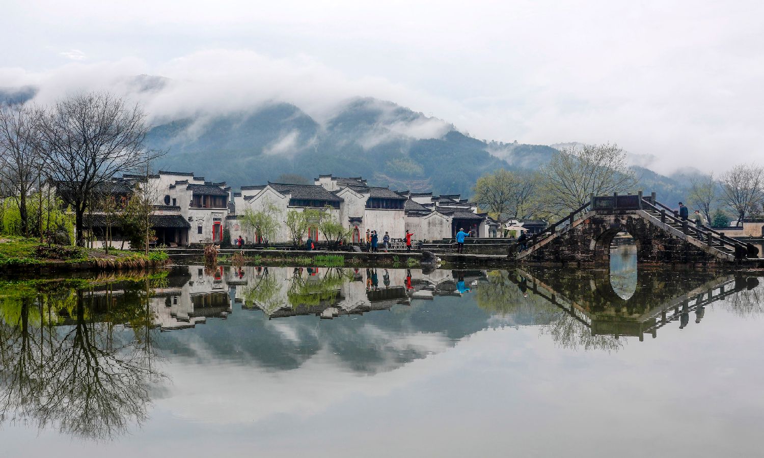 22日,春雨初歇的安徽省黄山市徽州区呈坎古村落碧波清影,吸引游客前来踏青赏春。