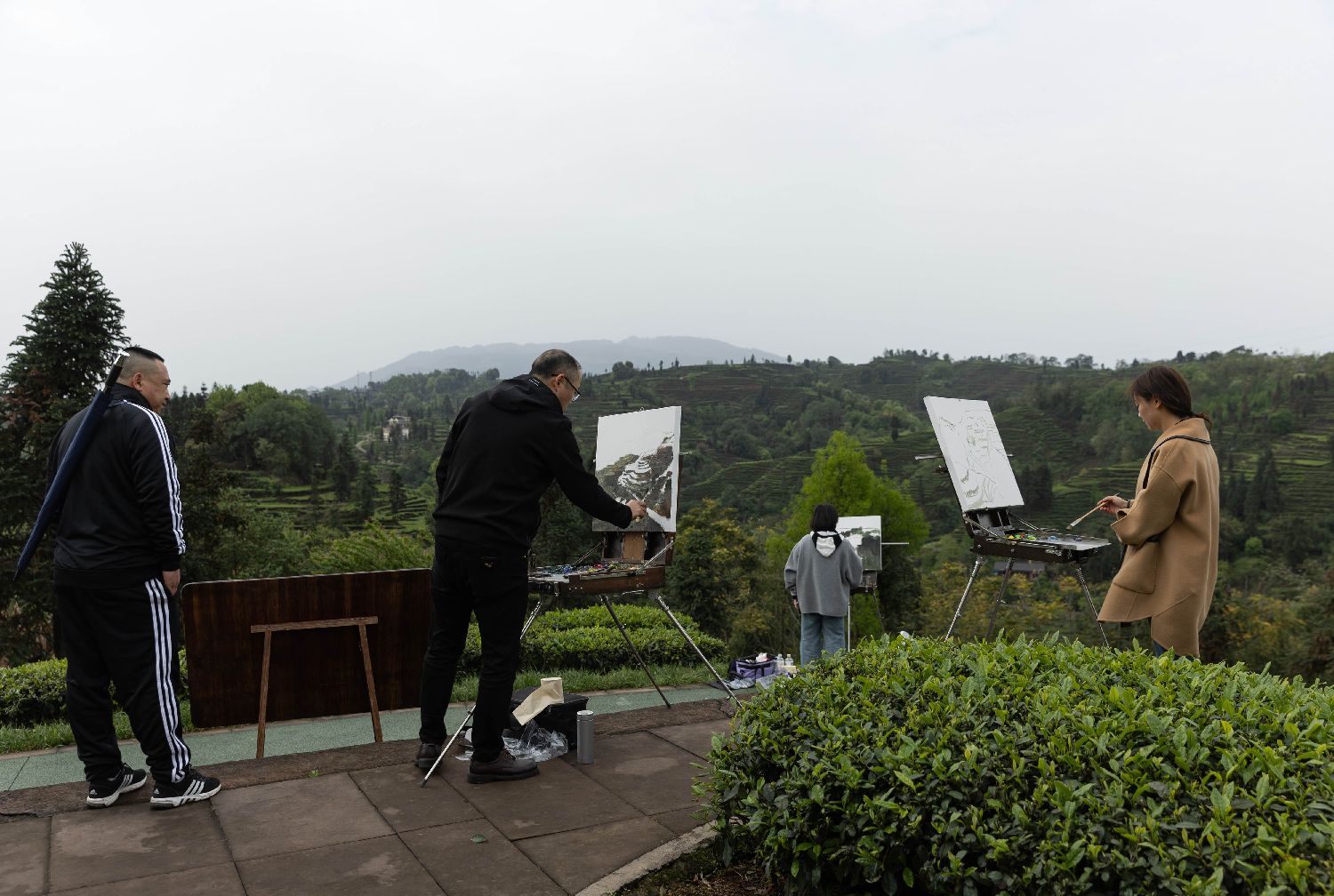 几名绘画爱好者6日来到青杠坪村茶园里写生。(图片来源:新华社)