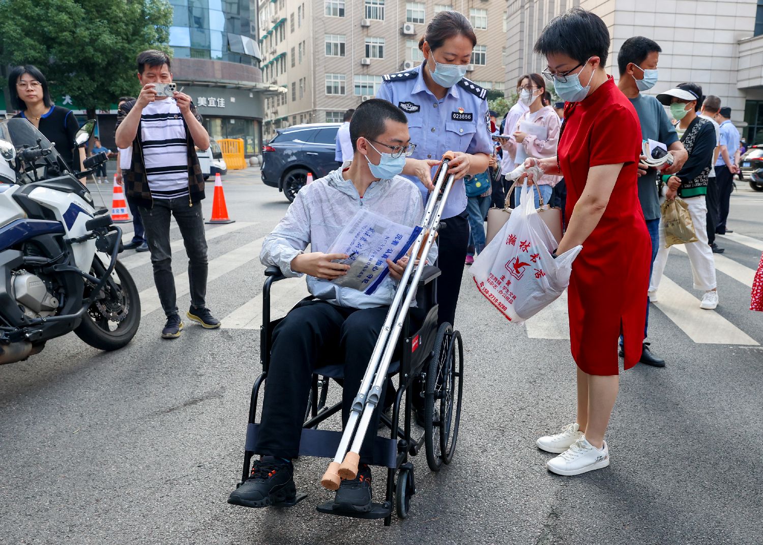 7日,湖北省武汉市,一名考生坐轮椅进入湖北省水果湖高级中学考点。