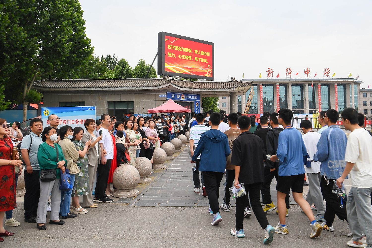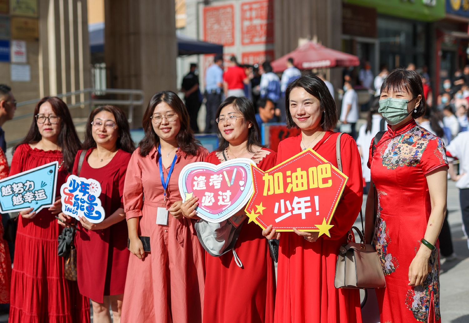 7日,北京陈经纶中学考点外,送考老师为考生加油鼓劲。