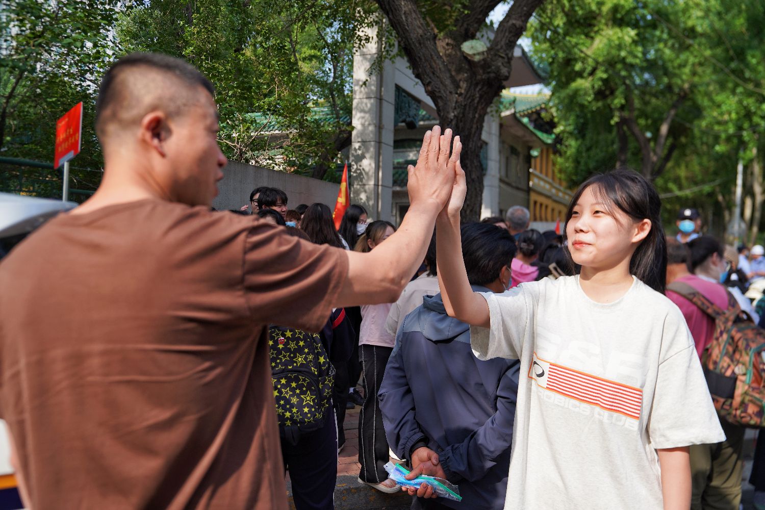 7日,黑龙江哈尔滨市第三中学考点,考生入场前与家长击掌。