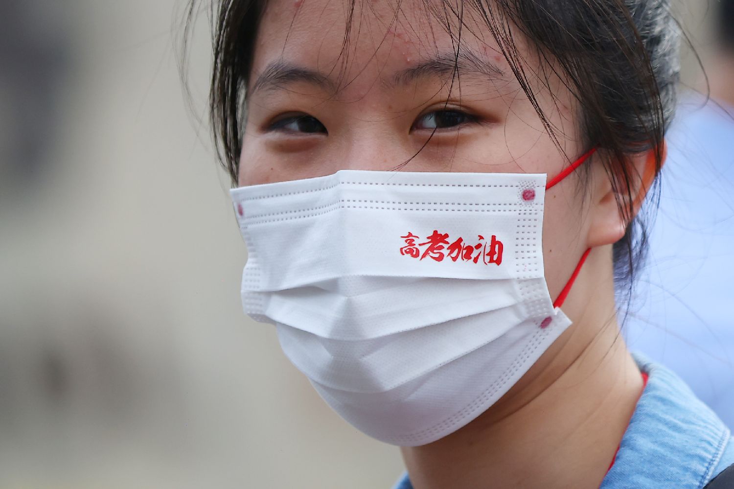 7日,江苏省南京市雨花台中学考点,戴着印有“高考加油”字样口罩的考生走入考场。