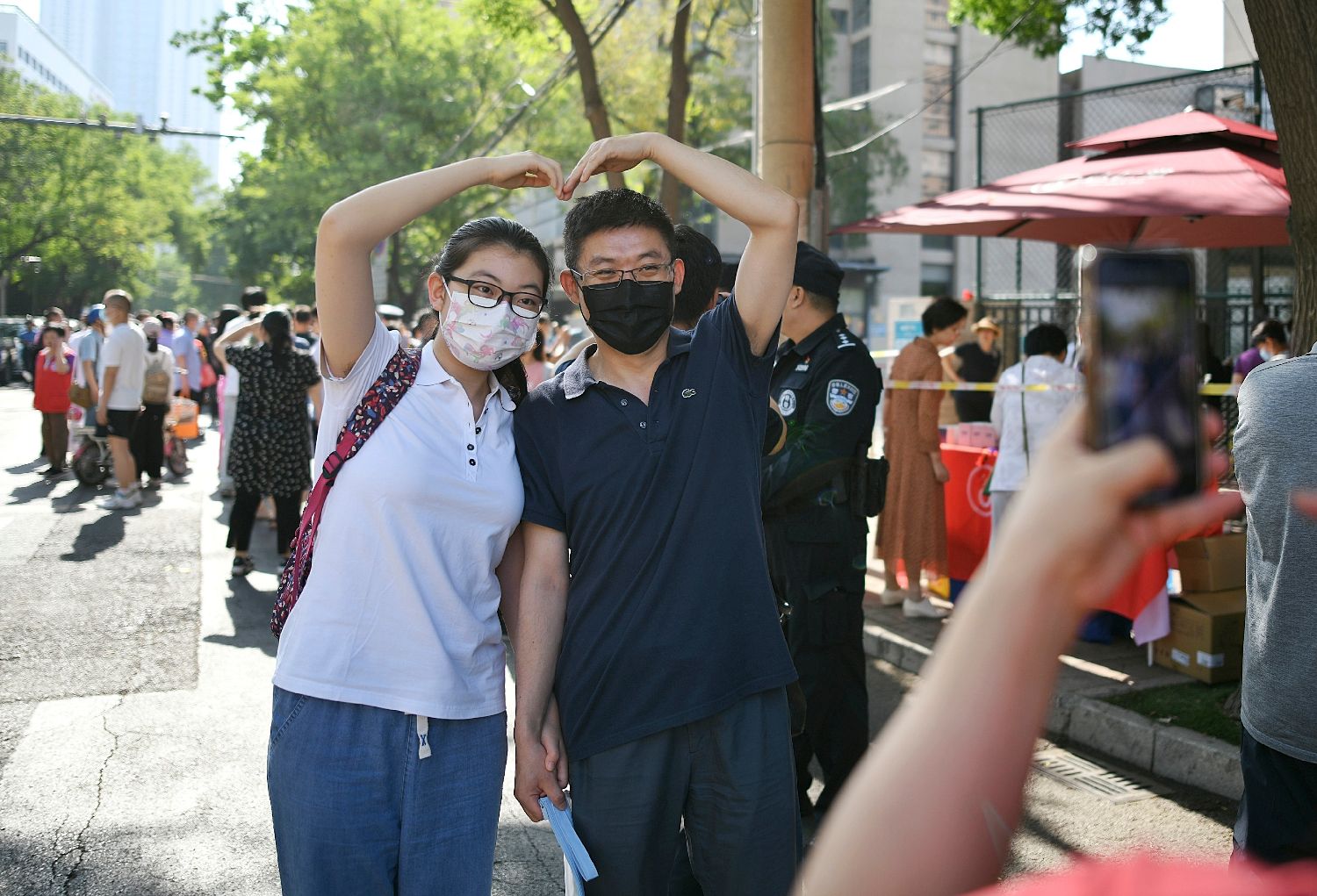 7日,在天津,考生与家长在考场外比心合影。
