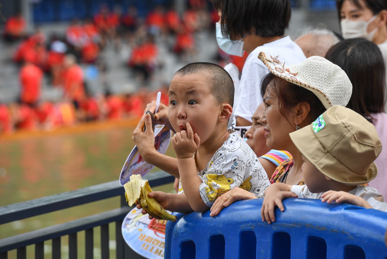 15日,小朋友被精彩的车陂龙舟赛吸引。(图片来源:新华社)