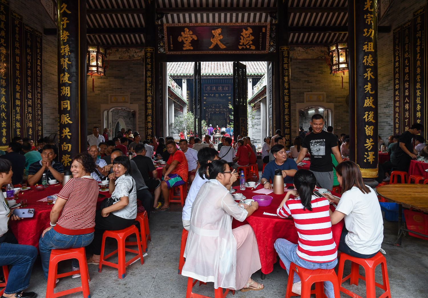 15日,2023年车陂龙舟竞渡第一名“范阳简”龙船会在简氏家祠里摆下几十桌龙船饭庆祝。(图片来源:新华社)