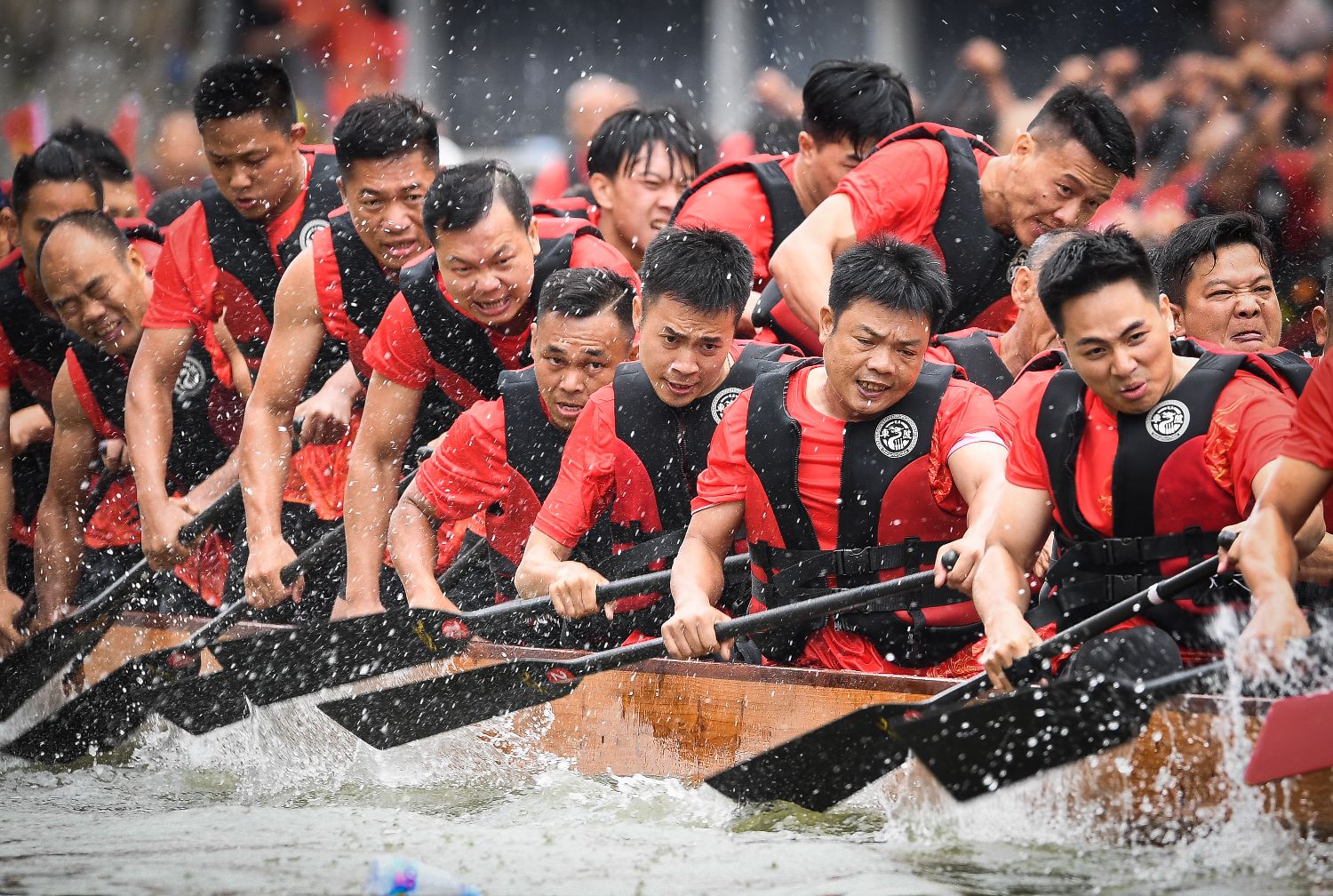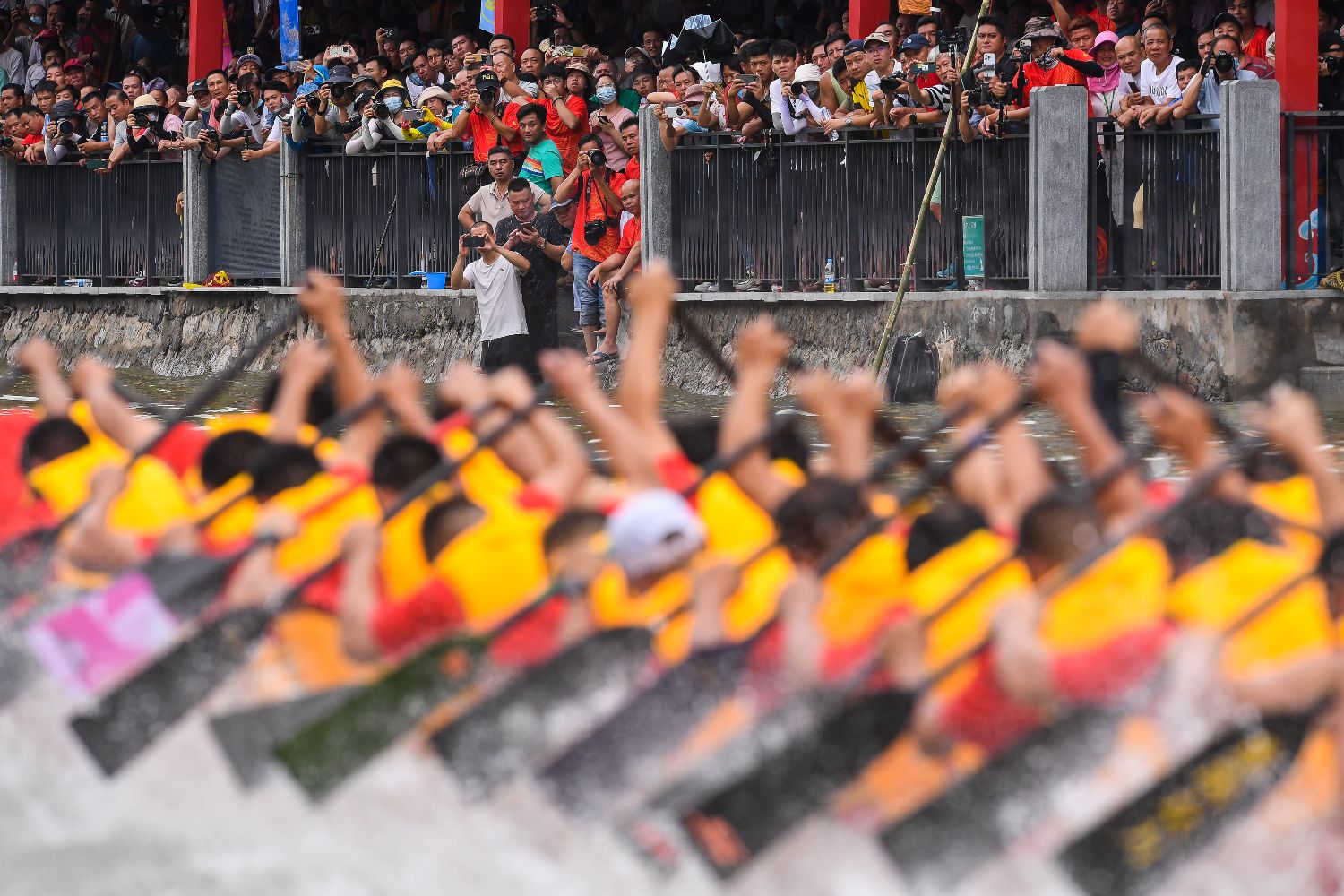 15日,在车陂龙舟竞渡赛场上,划手们全力扒桨奋勇争先。(图片来源:新华社)