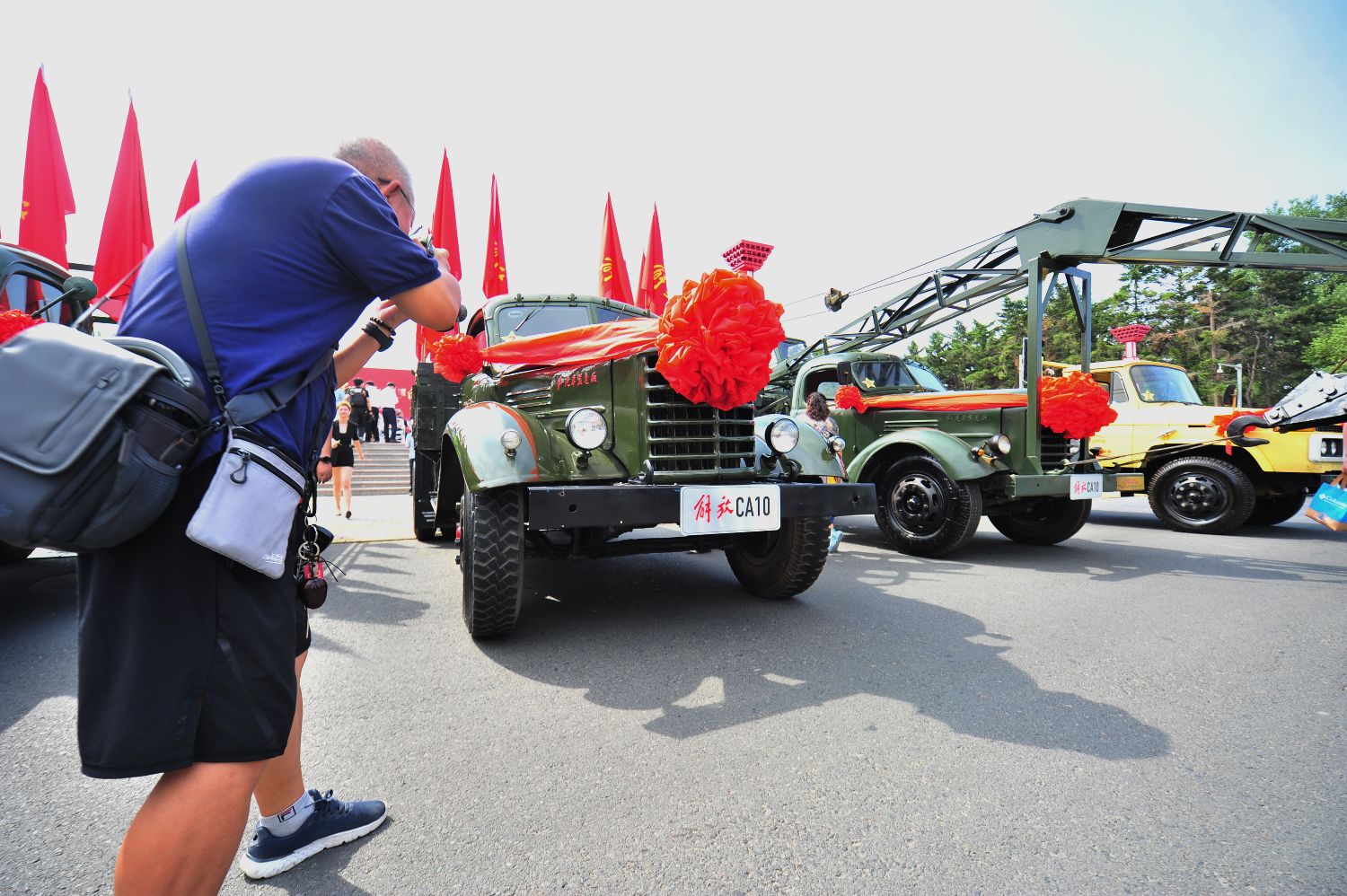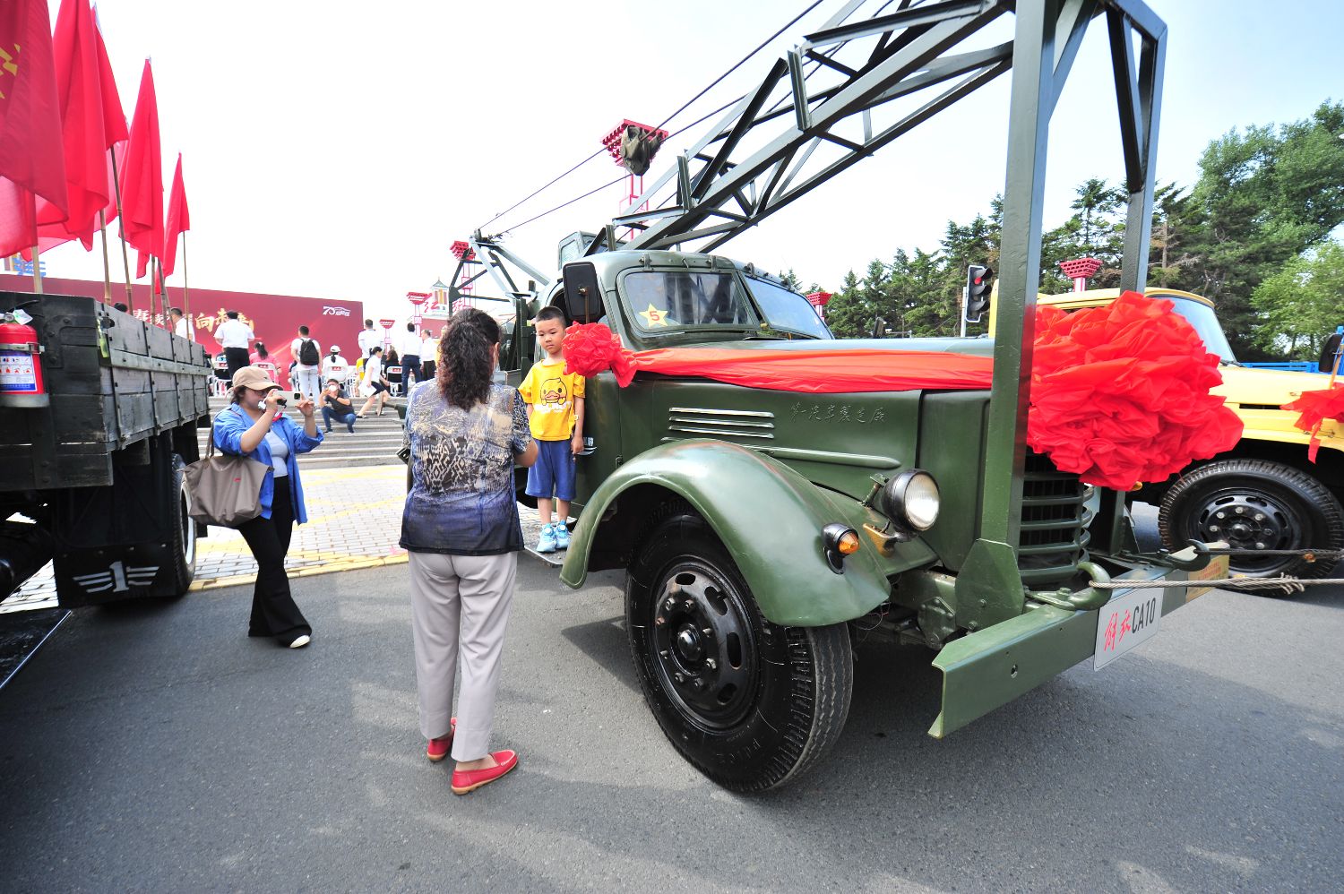 26日,吉林长春市民在参观第一代解放牌卡车。