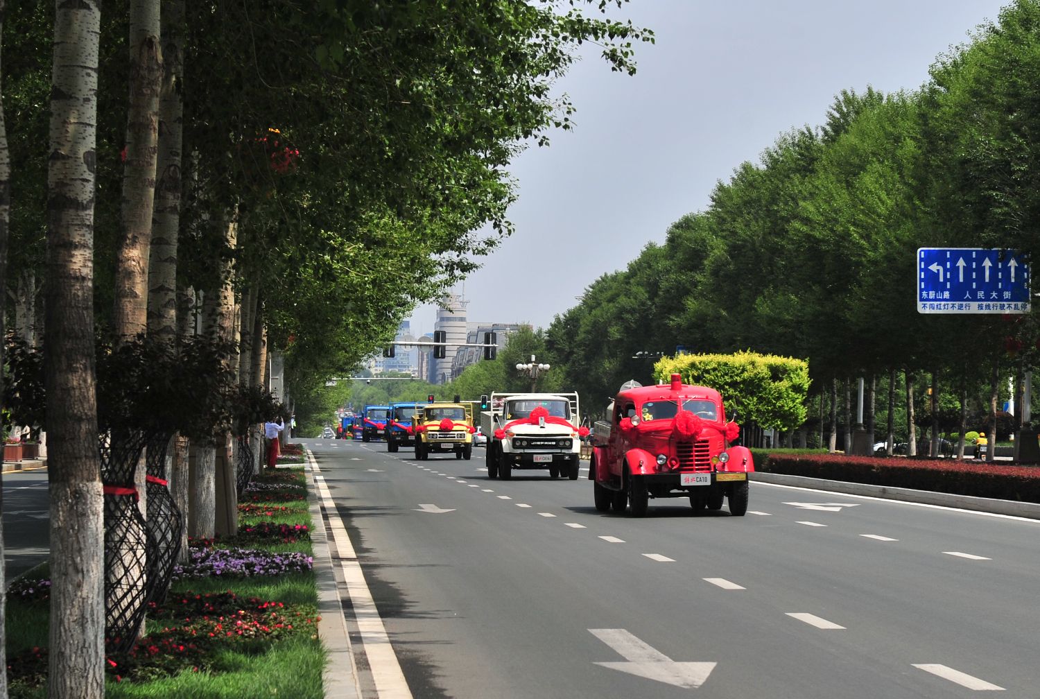 26日,吉林长春,一队由不同年代的解放牌卡车组成的车队行驶在城市街头。