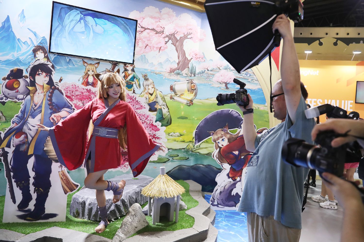 动漫游戏产业链上下游200多家中外企业参展。图为参观者在一处场景拍照。(图片来源:中新社)