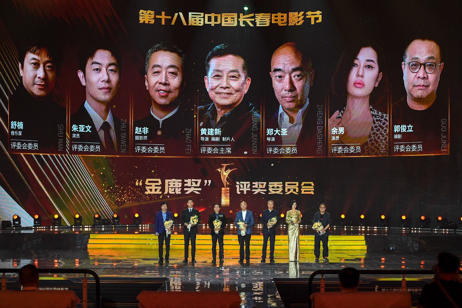 28日,第十八届中国长春电影节评委会成员在开幕式现场亮相。