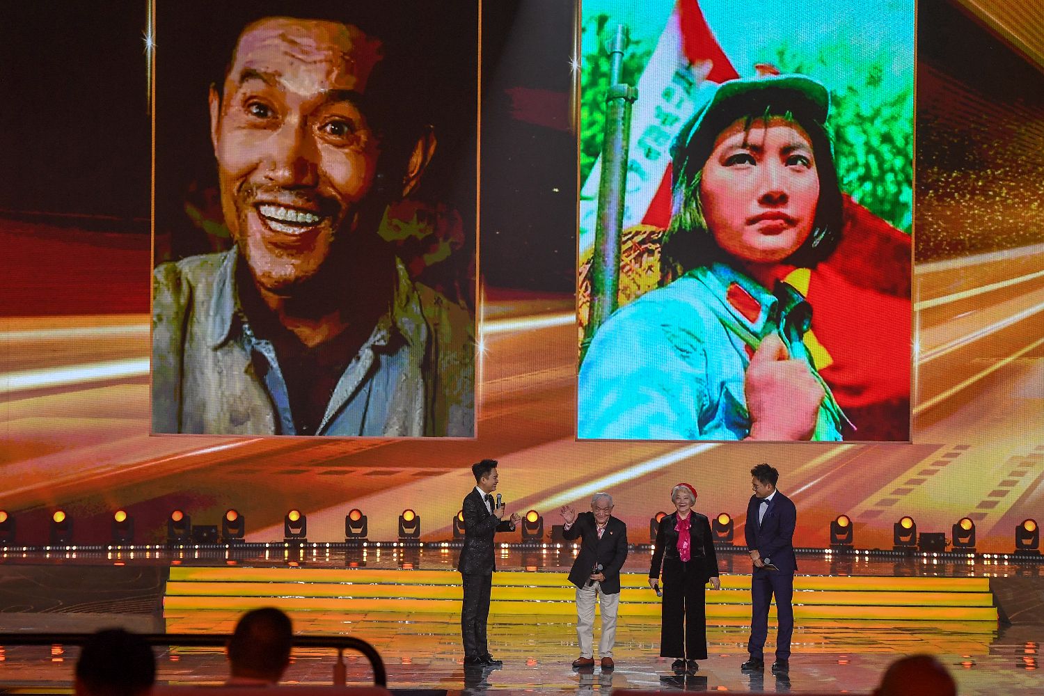 28日,演员牛犇(左二)、祝希娟(右二)在第十八届中国长春电影节开幕式现场致辞。