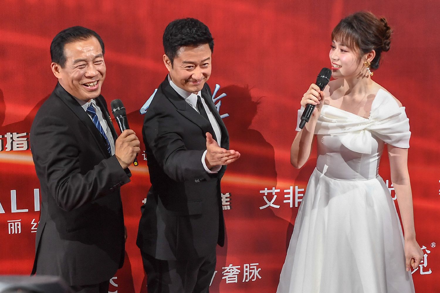 28日,第十八届中国长春电影节形象大使吴京(中)在红毯仪式上亮相。