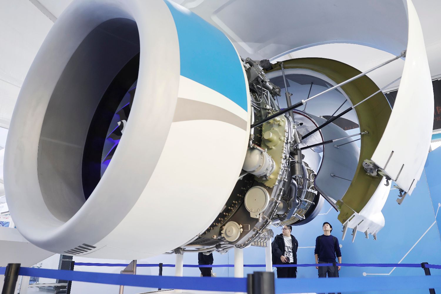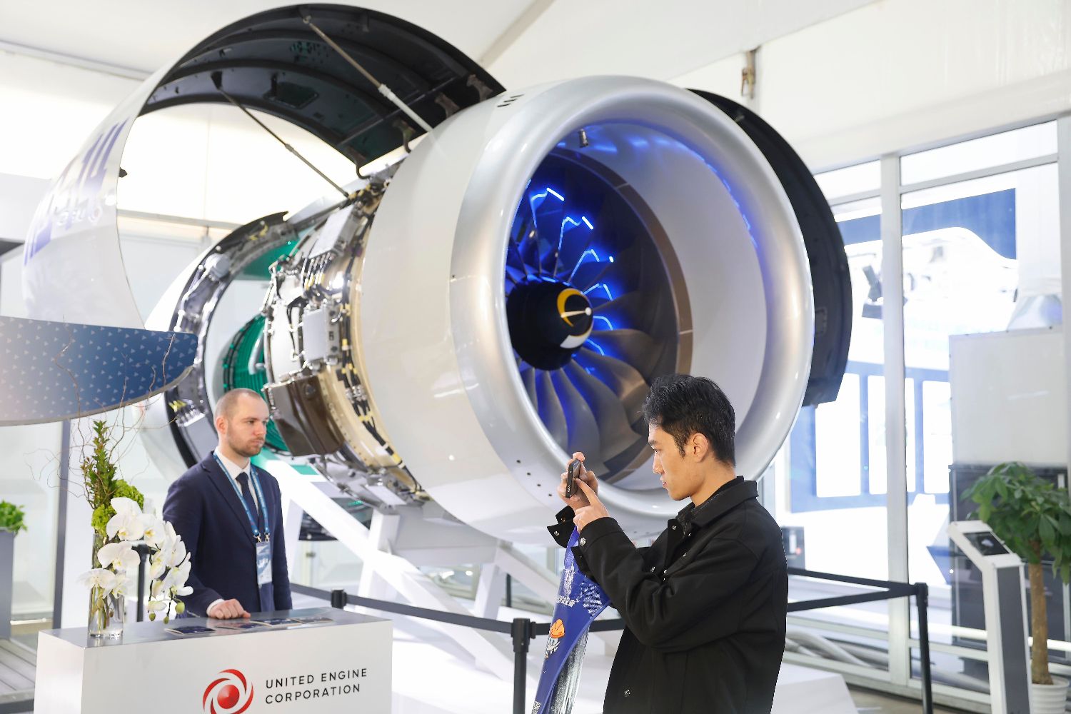 图为参观者手机拍摄联合发动机集团公司(UEC)自主研发的大涵道比涡扇发动机PD-14模型。