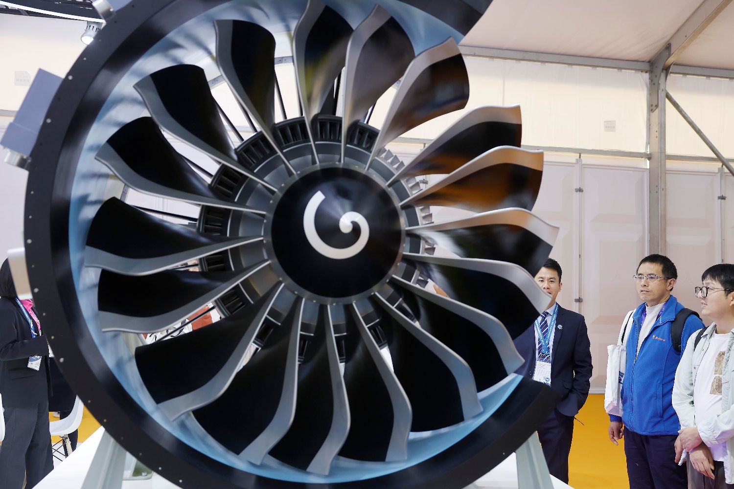 图为参观者了解中国首个大型客机发动机CJ1000A仿真模型。