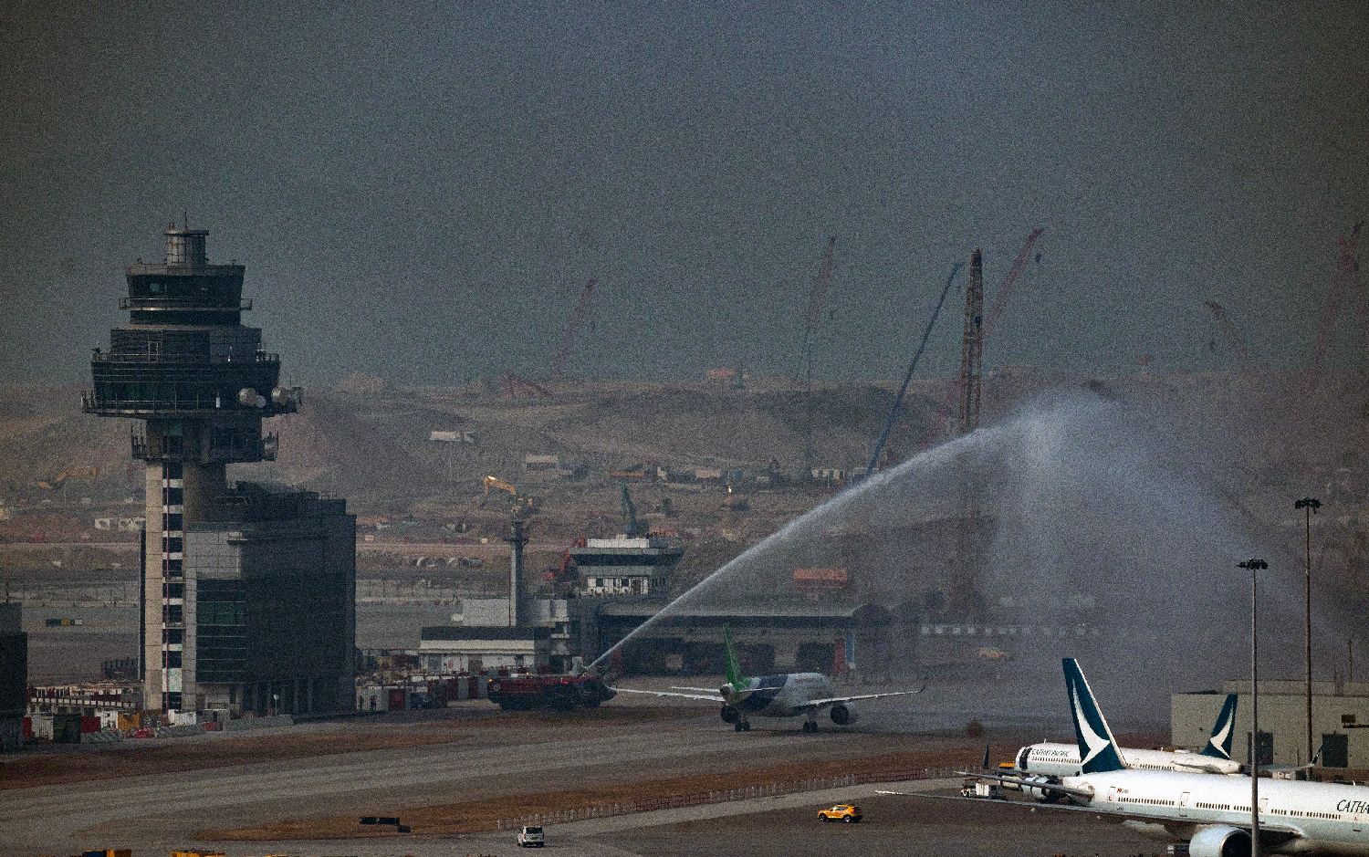 C919降落在香港国际机场后通过水门欢迎仪式。