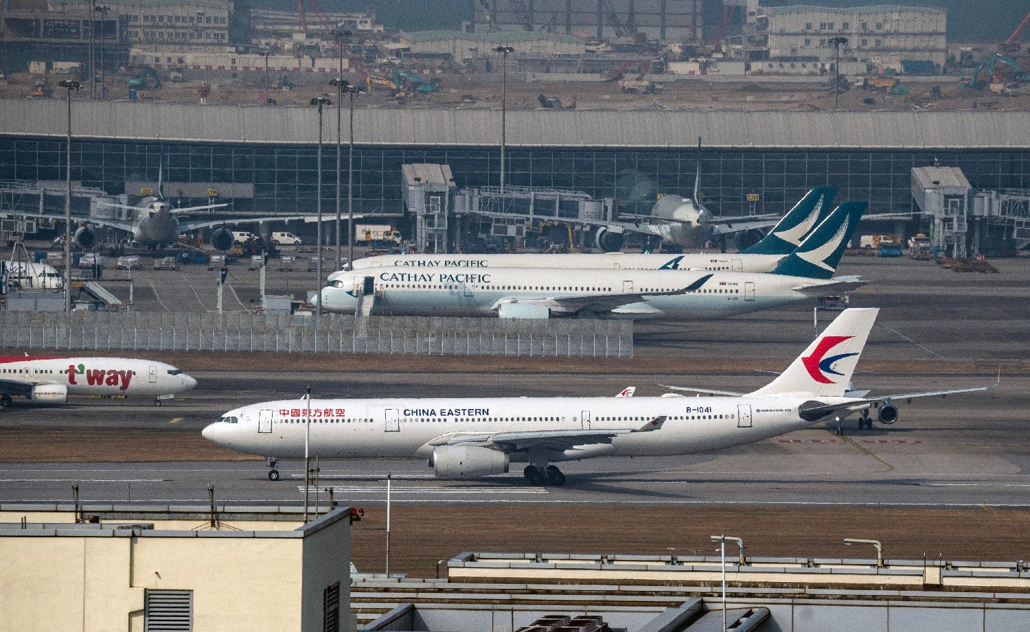 中国东方航空公司的一架客机在香港国际机场跑道滑行。