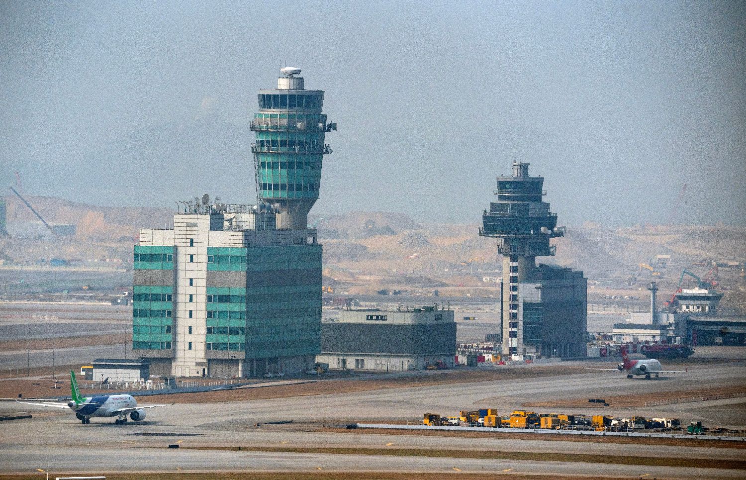 C919(近端)和ARJ21(远端)降落在香港国际机场后准备通过水门欢迎仪式。