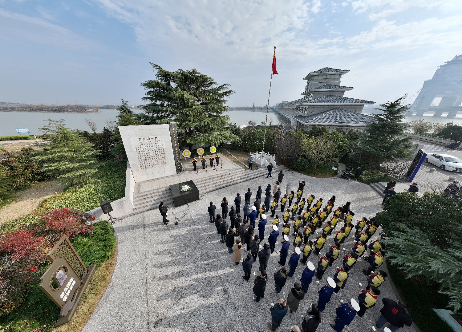 各界群众13日在江苏扬州侵华日军万福桥大屠杀遇难同胞纪念碑前举行悼念活动(无人机照片)。