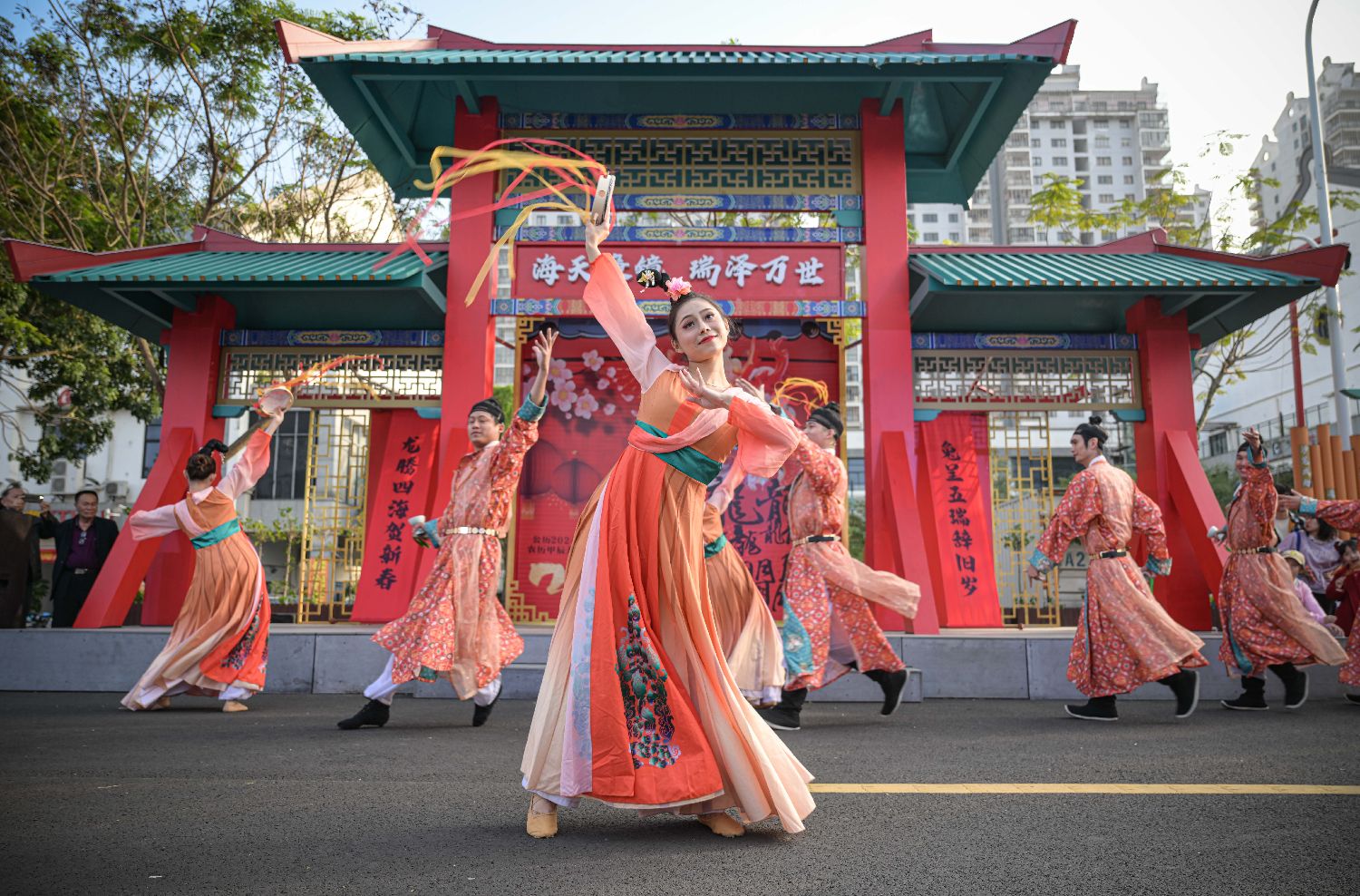 12日,在位于海南省海口市的第十六届万春会分会场——海瑞文化公园春节系列活动中拍摄的舞蹈演艺现场。