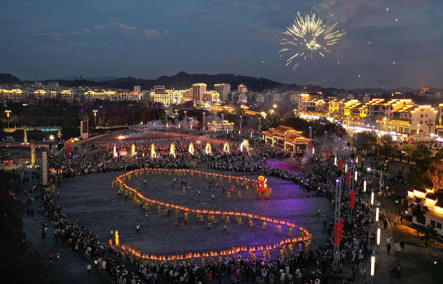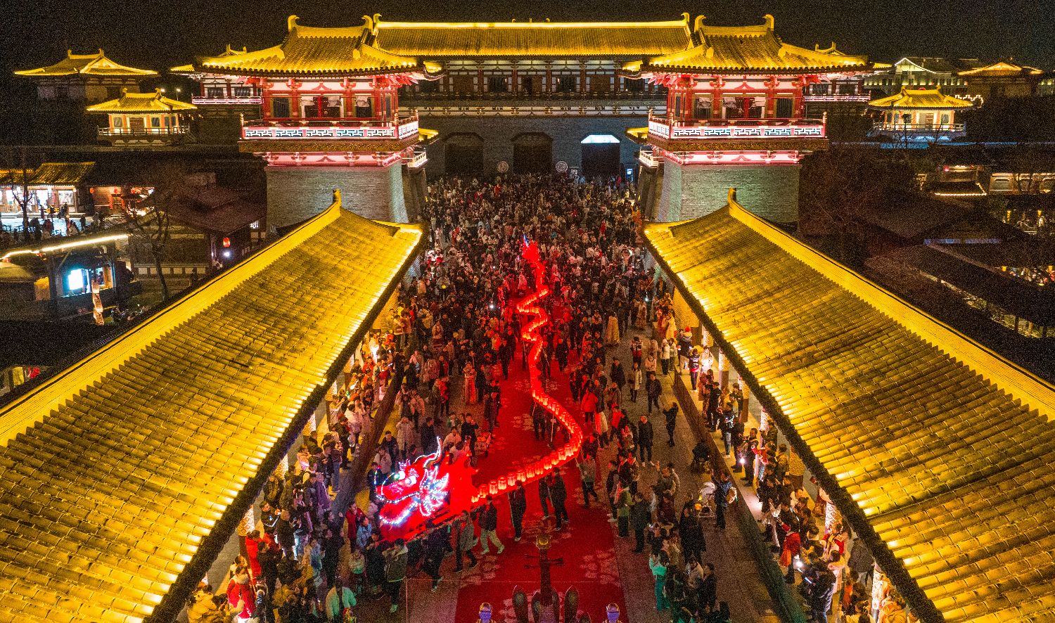 游客12日在湖北省襄阳市唐城景区观看板凳龙灯巡游表演(无人机照片)。