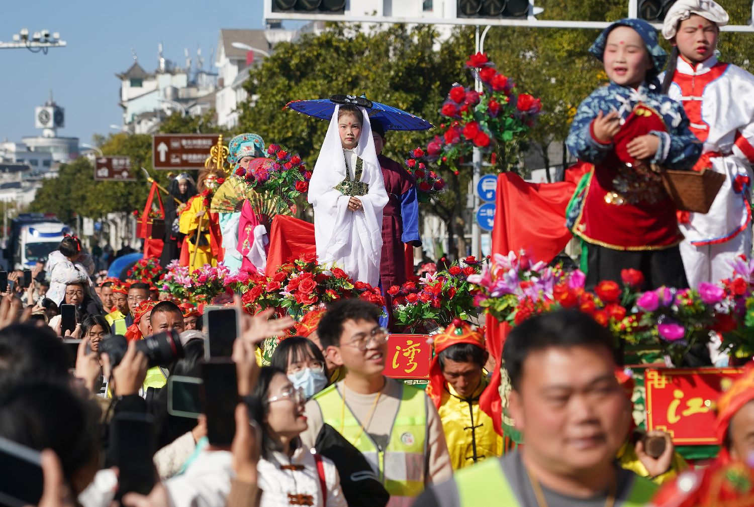 在江西省婺源县举办的“婺源非遗贺新春”巡游展演活动中,演员12日在进行巡游展演。