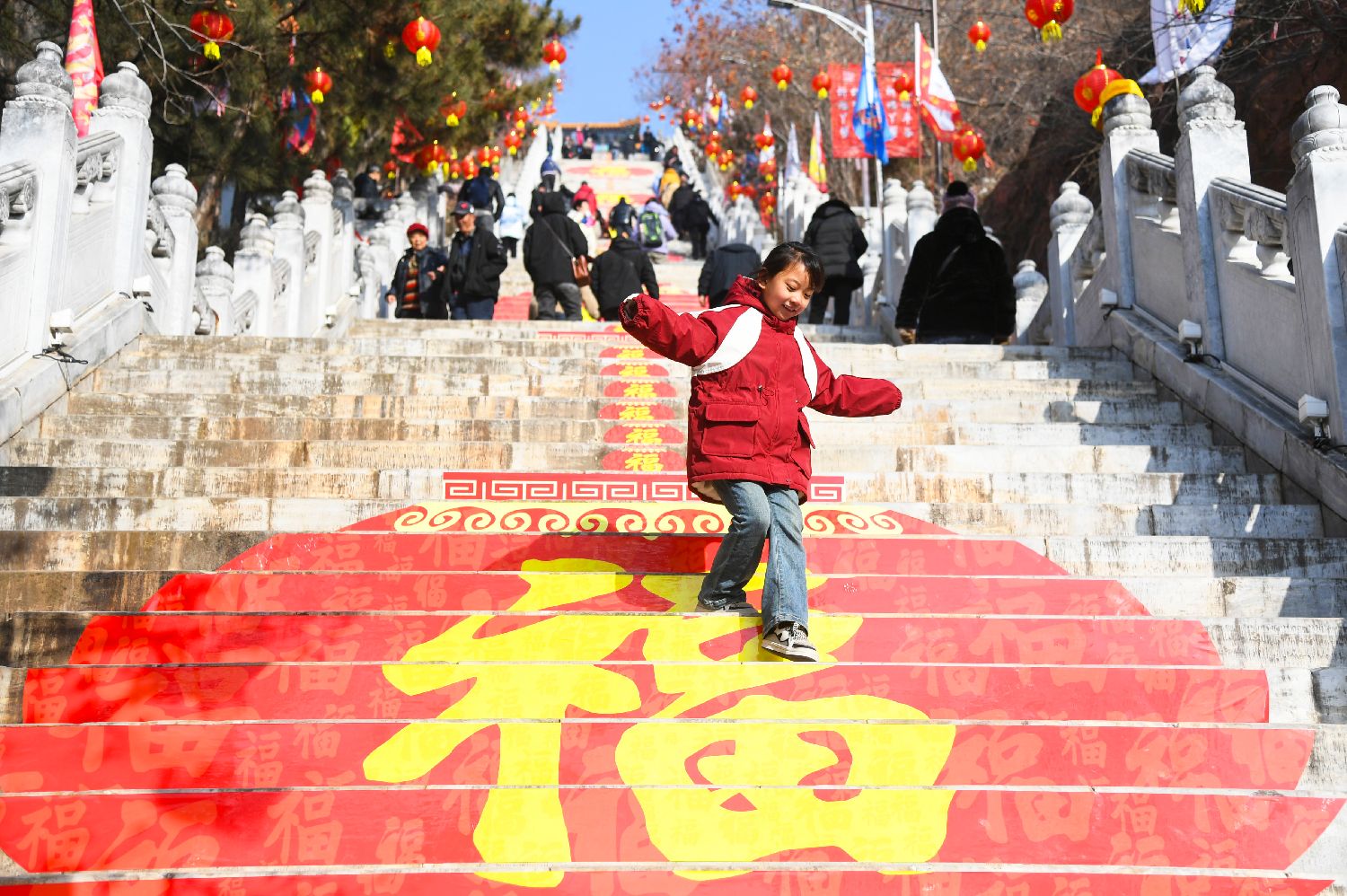 13日,游客在北京市平谷区丫髻山春节祈福庙会中登山祈福。