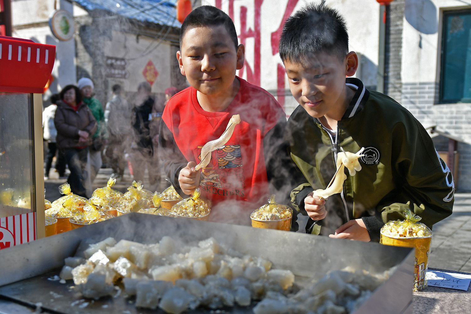两名小朋友13日在山东省烟台市芝罘区一处文化街区品尝特色小吃。
