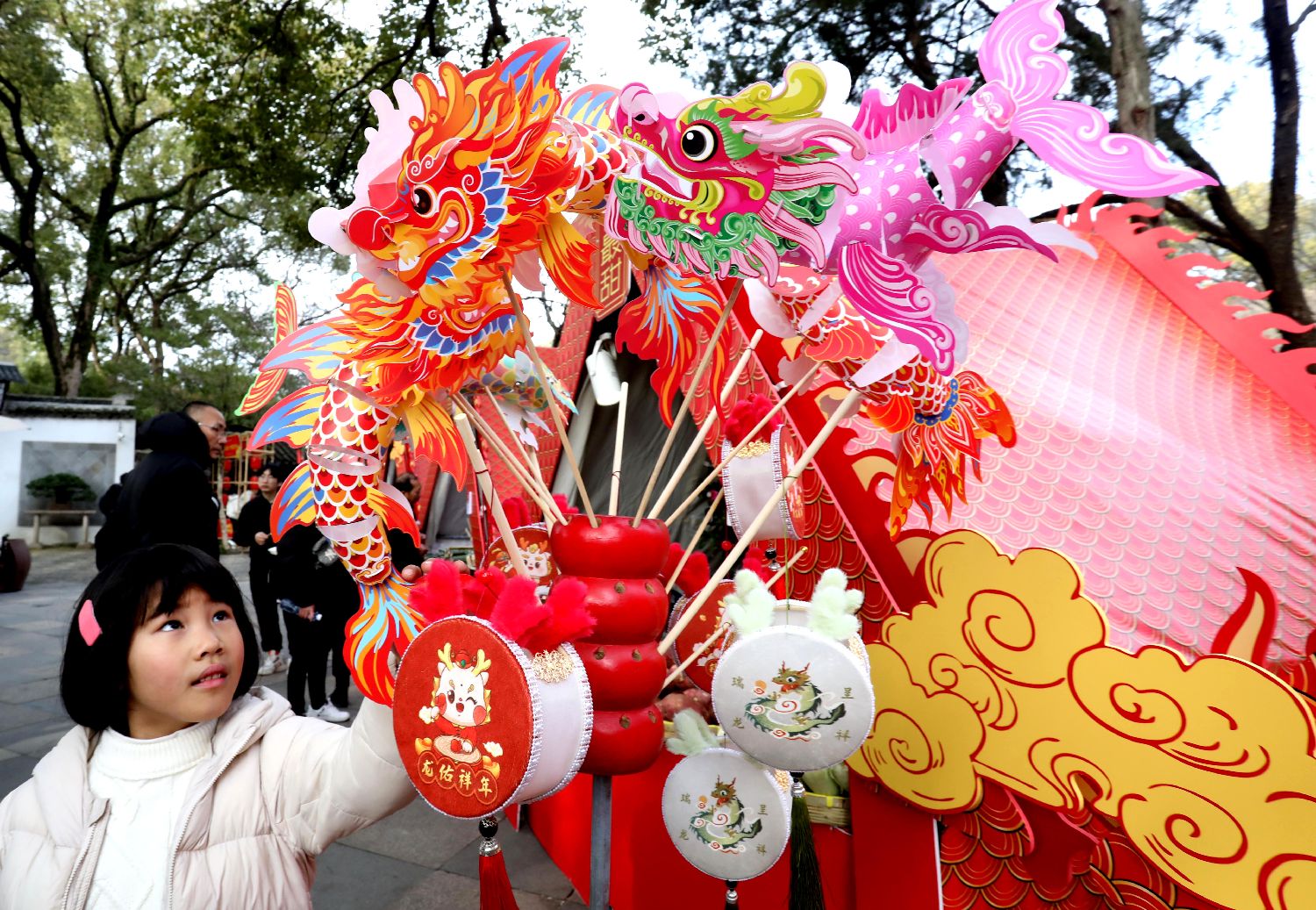 小朋友13日在江苏苏州虎丘新春庙会上欣赏龙年饰品。
