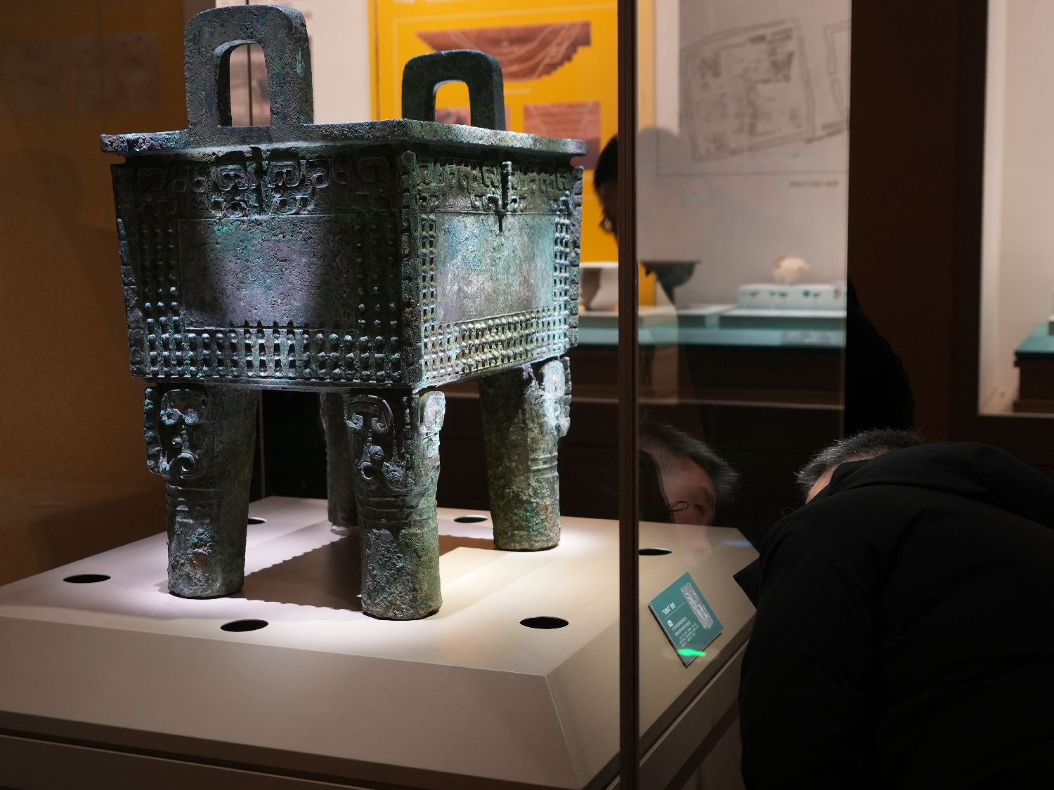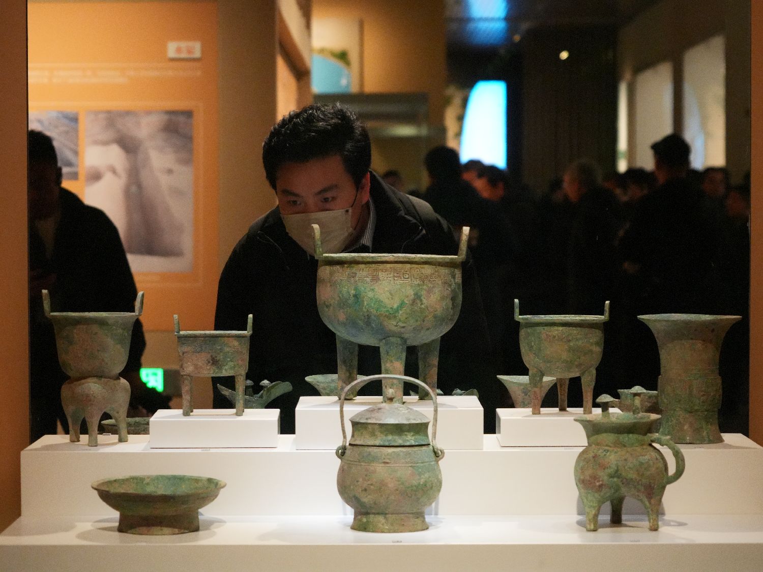 图为成组青铜器吸引参观者观看。