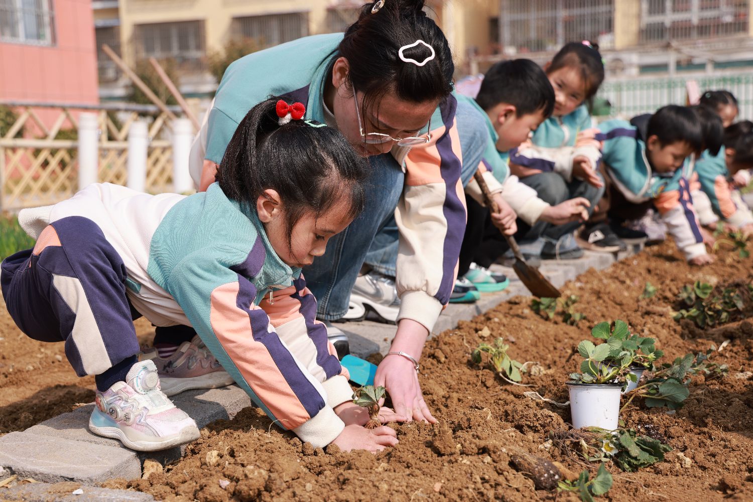 11日,山东省枣庄市峄城区底阁镇中心幼儿园开展丰富多彩、各具特色的传统民俗活动,欢庆“二月二”。图为学生们在老师的带领下春种。